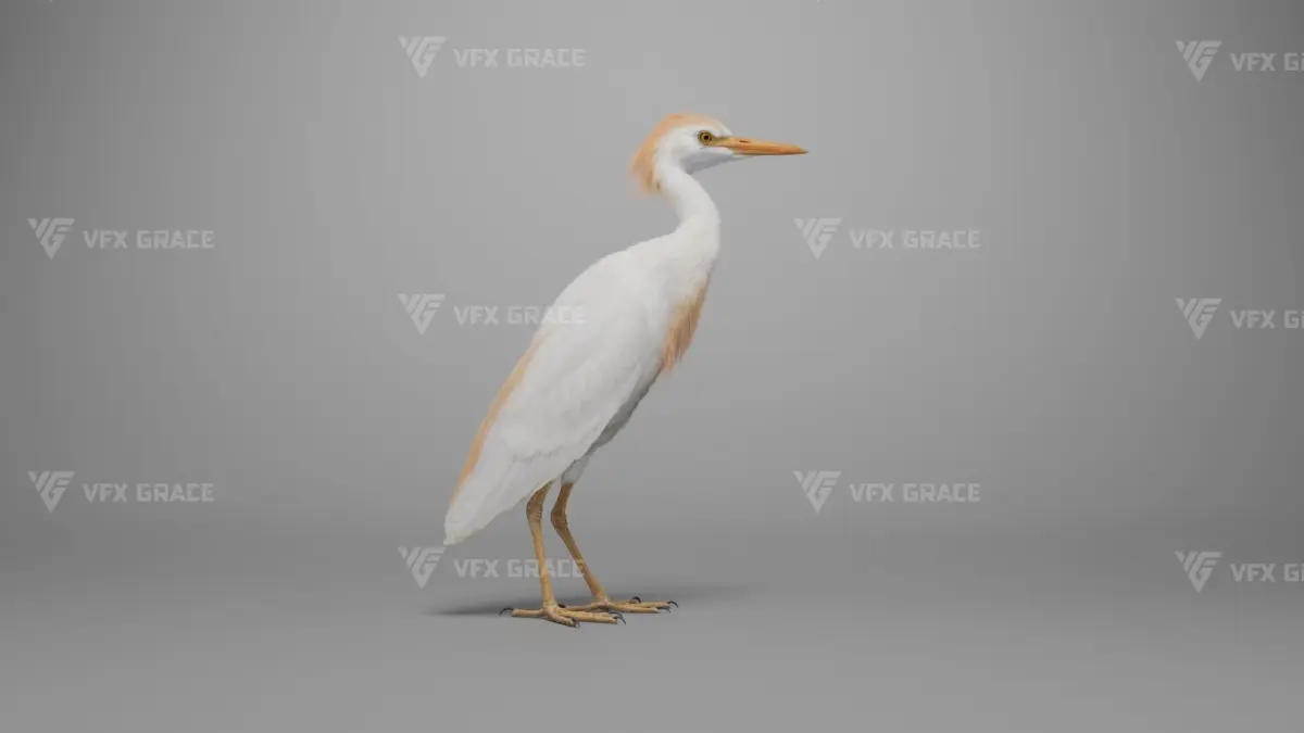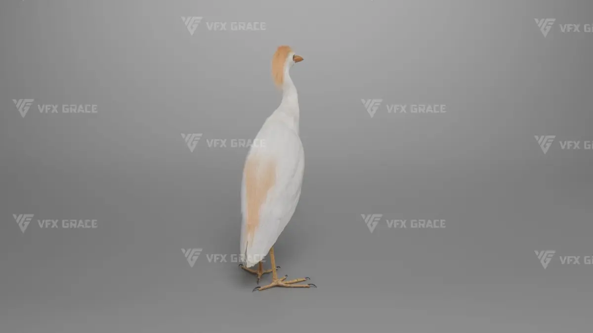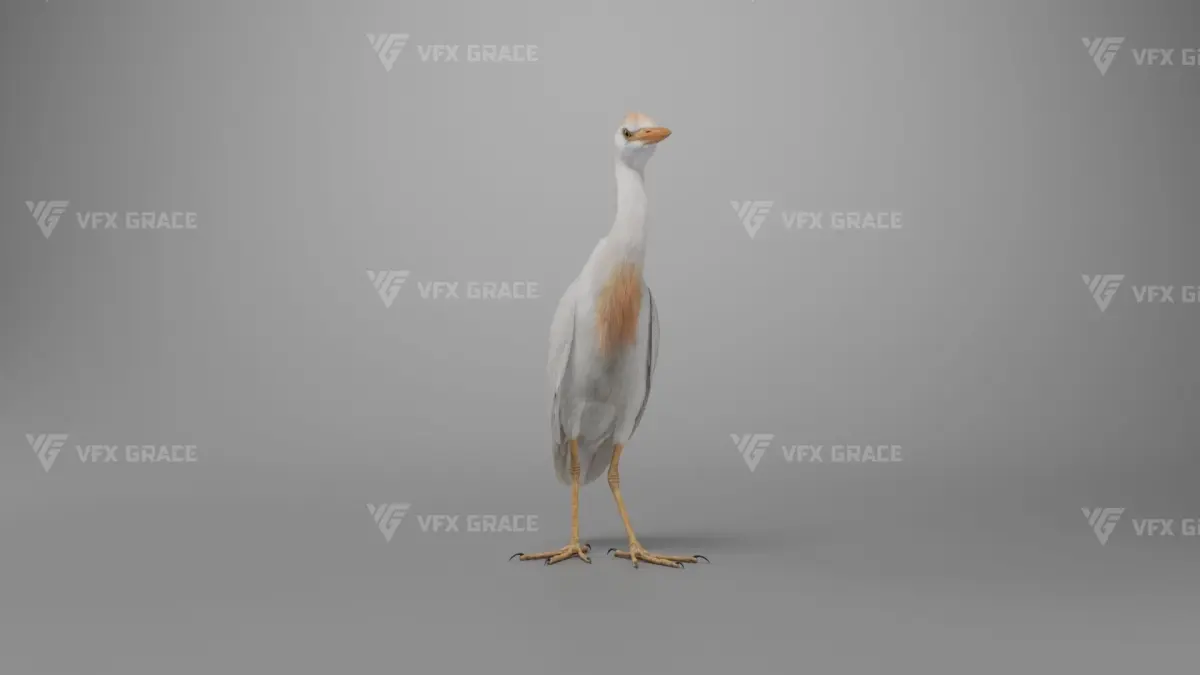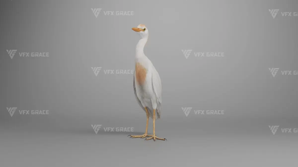 This is a high-quality cattle egret character with a model, textures, feather cards, rigging, and four lifelike animations. The model features accurate muscle structures; both the body and feather textures are created in 4K resolution. To enhance realism, the decorative feathers on the back are simulated with hair dynamics according to the animation. The rigging is highly detailed, allowing for flexible control over body movement. This model is made with Blender and Cycles renderer at real-world scale.