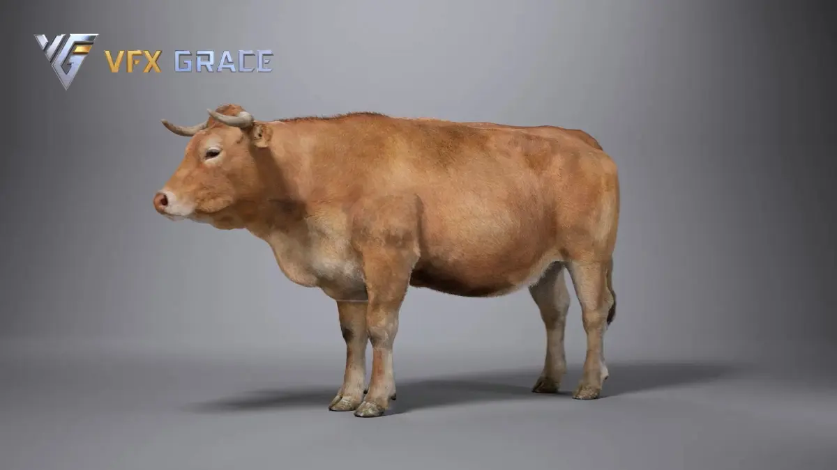 Model Details: Total vertex count is 38,527 and polygon count is 38,485, ensuring the model's intricacy and realism.Textures and Materials: Textures are created using UDIM format and produced in 4K resolution. Textures have already been imported into UE and optimized.Groom Fur: A complex fur system was created in Blender, and the cattle's fur styling has been perfectly replicated using UE's Groom technology, with finely tuned materials.