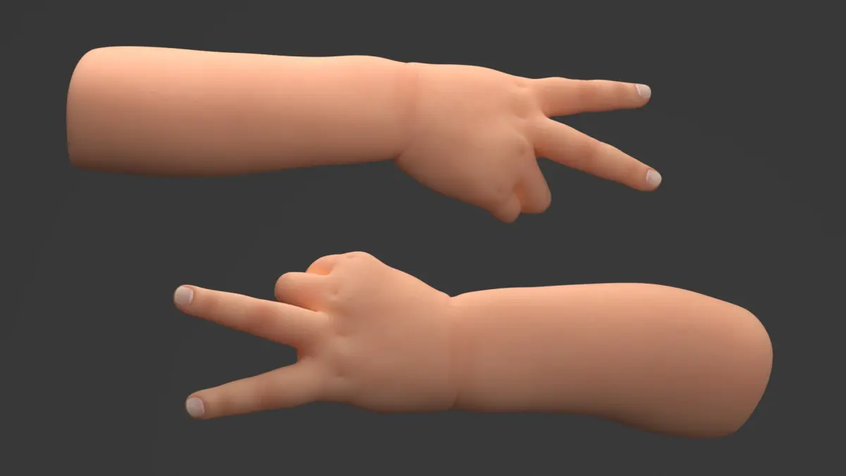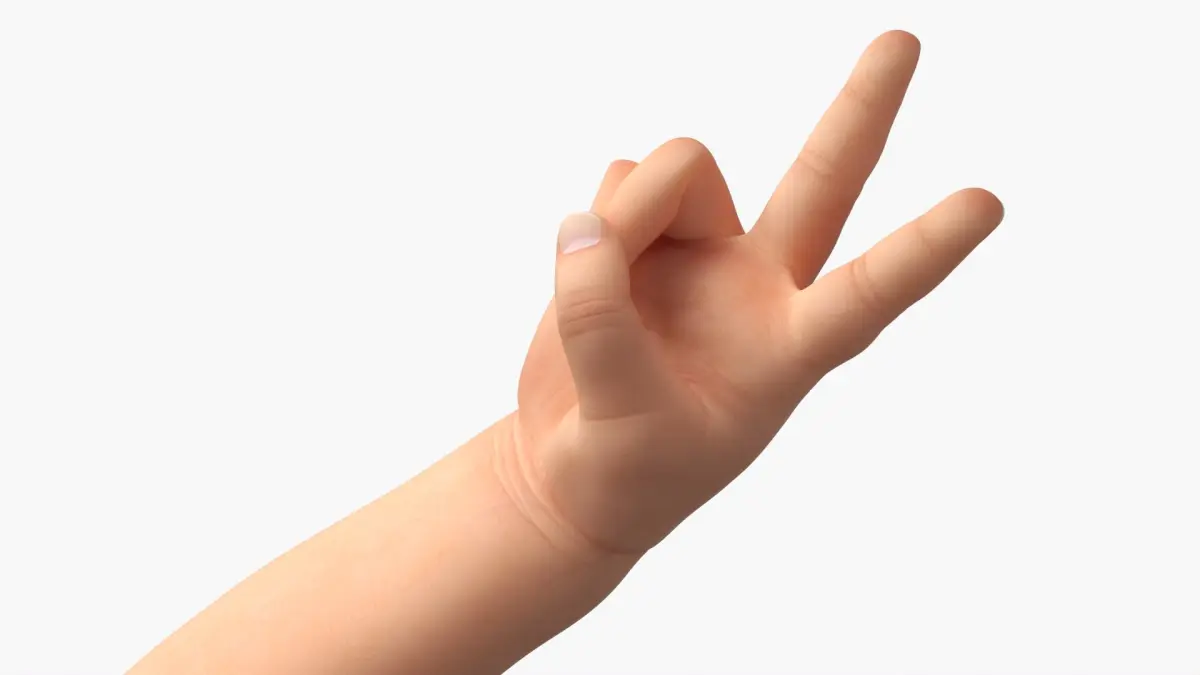 Caucasian Baby Hand Victory Gesture is a three-dimensional model of baby's hand making a victory sign, a common symbolic gesture associated with peace and success.