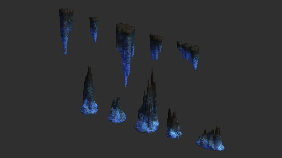 A set of 10 cave rocks, all sharing the same 2K texture in .png format. Textures have Diffuse, Specular, Height, Emission, and Normal maps. The models are low-poly, game-ready, watertight, and can be subdivided. Available formats are: 3ds .obj .fbx .blend, and .dae. Previews were rendered in Anim8or. Blender was used for file conversion.