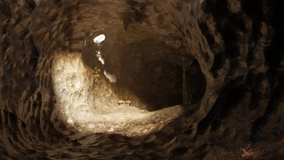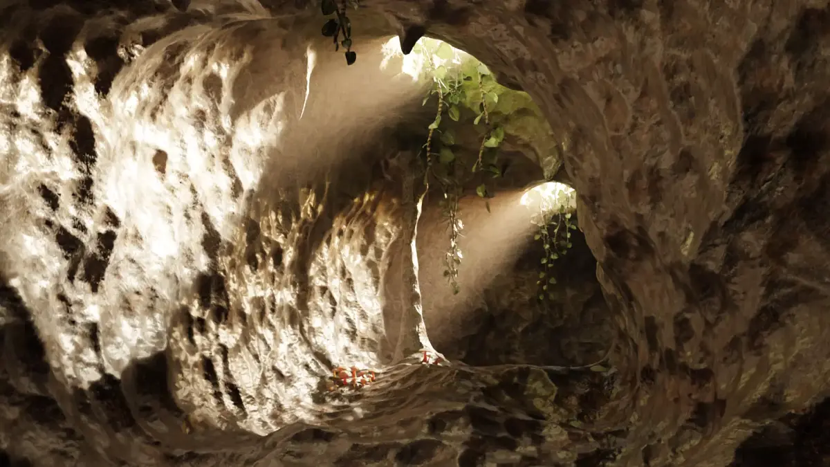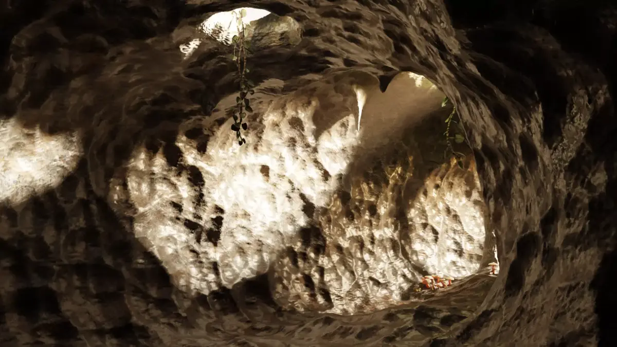 A connected cave environment formed by a continuous system of chambers and corridor-like passages shaped by organic rock formations. Vertical openings in the ceiling create natural depth and visual variation, allowing different compositions. Stalactite and stalagmite columns define the interior space, supported by layered, naturally folded rock surfaces. The environment includes integrated vegetation such as hanging plants with broad leaves and scattered mushrooms. Built as a single cohesive asset, the cave offers multiple distinct views and spatial moods within one environment.