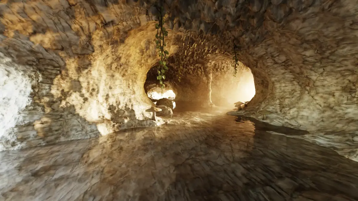 A complex cave environment built around a multi-directional interior layout with several entrance portals and ceiling openings that introduce depth and spatial variation. The environment features a central cave space branching into multiple interior zones, creating a sense of scale within a single connected rock formation. Integrated water, vegetation, and rock elements give the cave a warmer, more natural character while supporting varied compositions across the environment.