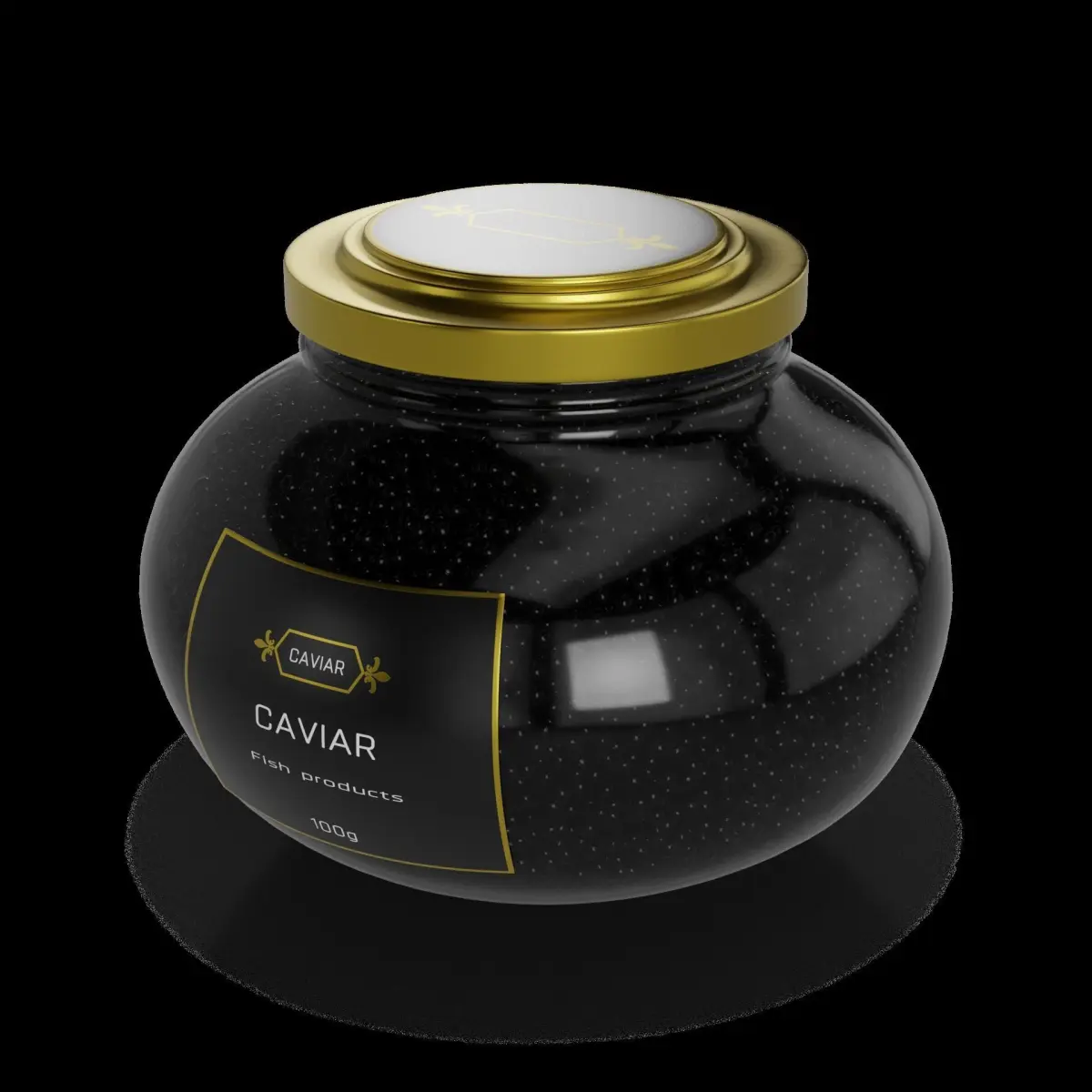 Caviar: Elevate your culinary experience with our finest caviar. Packaged in an elegant glass jar, this exquisite delicacy is a feast for the eyes. The jar is adorned with a silver lid, featuring an intricate design of swimming fish, adding a touch of artistry to the packaging. Inside, you'll discover a generous serving of large, lustrous pearls, ranging in color from deep black to vibrant golden. Each jar contains 100 grams of this luxurious treat, perfect for indulging in the finer things in life.