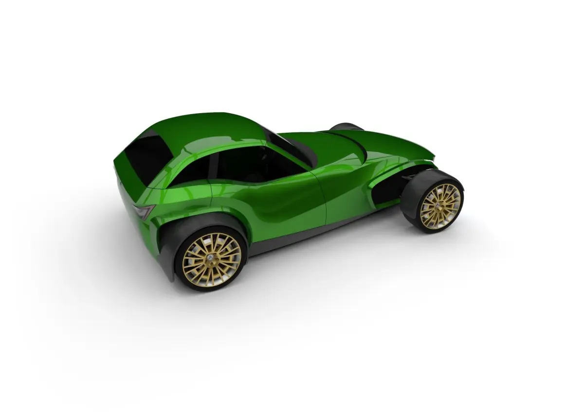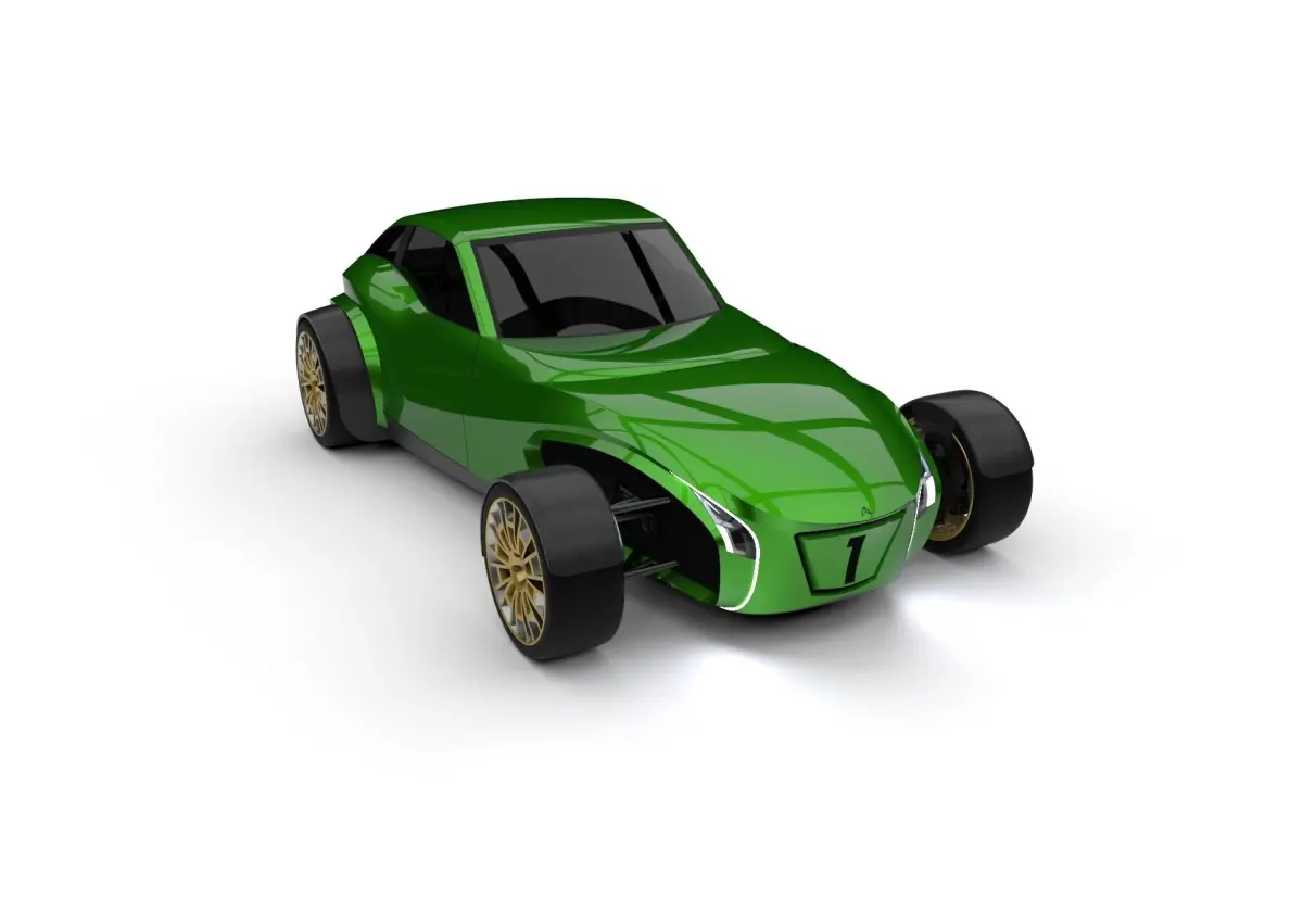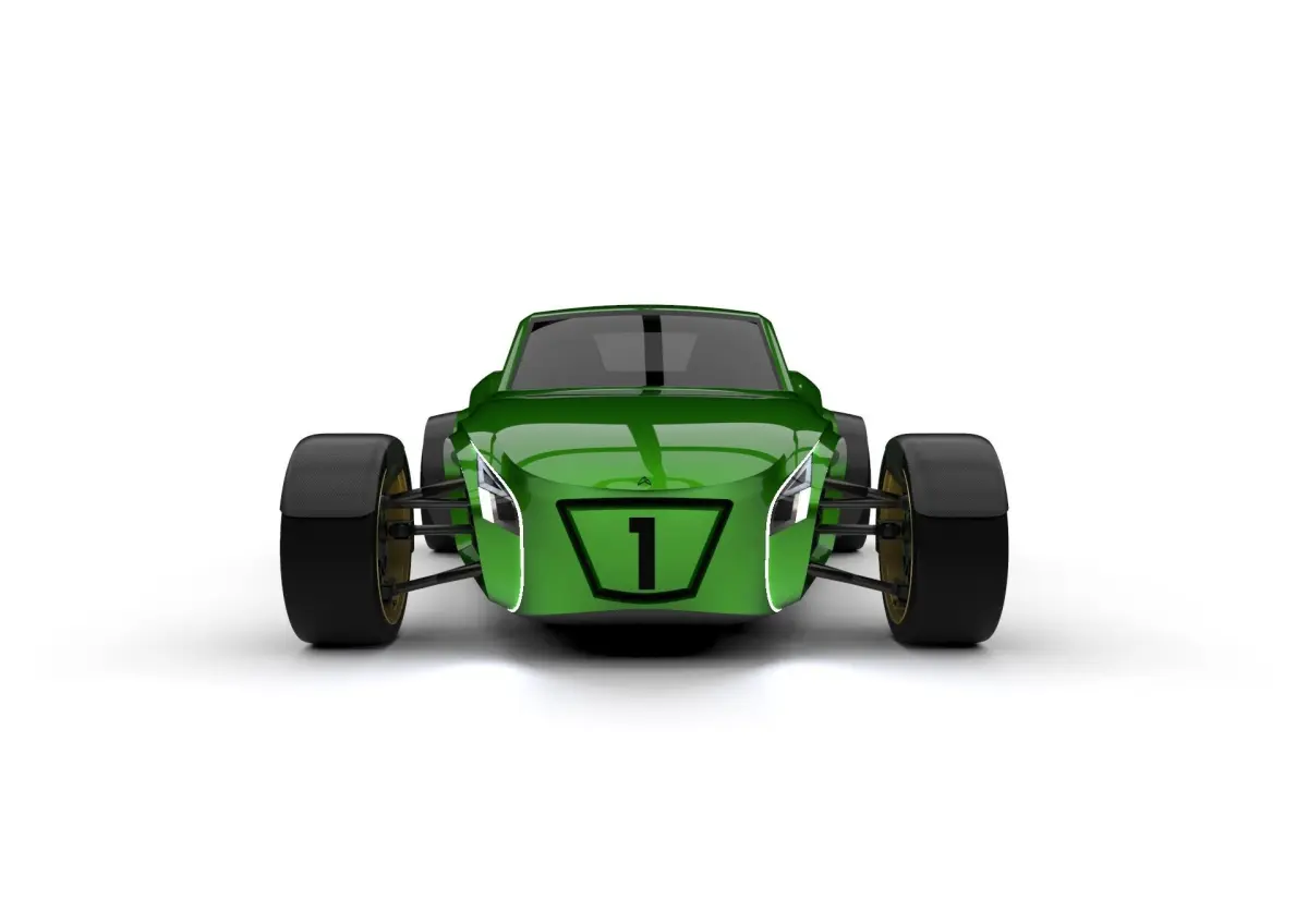 the One is a light sports vehicle, inspired by the famous super seven, this design is inspired by its silhouette and its lightness, but updated to an electric propulsion system, it has a removable hood and its wheels inspired by the classic sports cars of the 70.