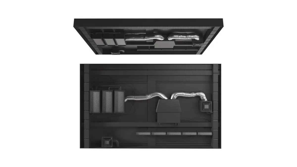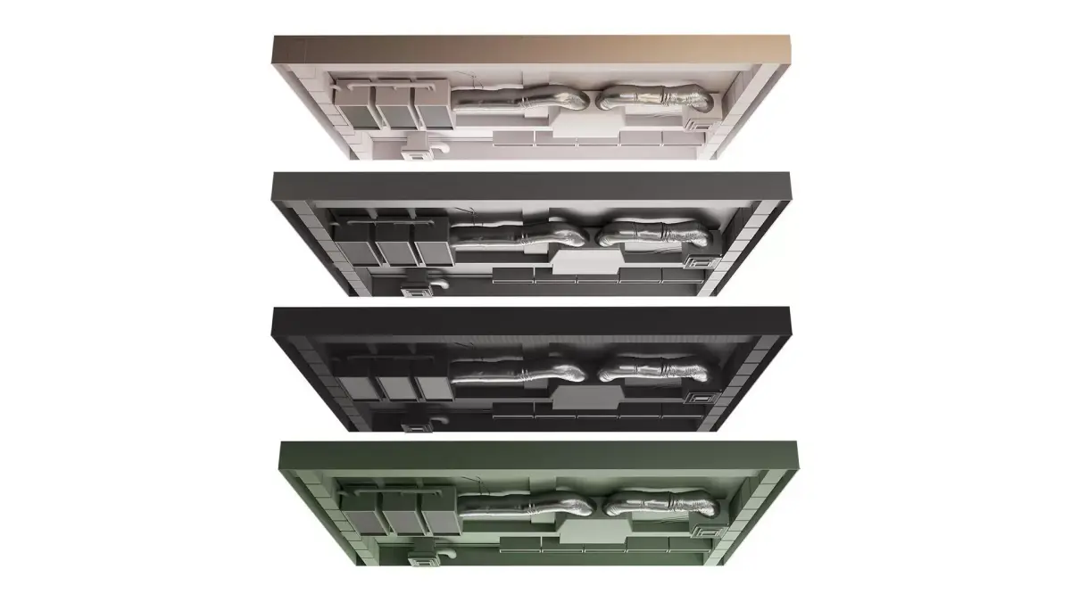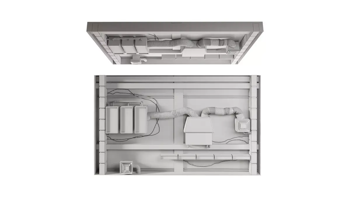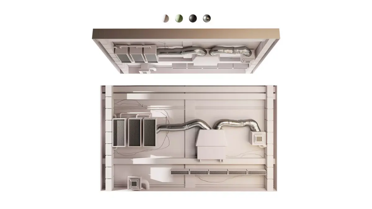 Ventilation, cable, cable channel, electrics, lighting, air conditioning, office ceiling, restaurant ceilings, garage, for visualization of industrial premises, industrial ceiling, grille on the ceiling, supply and exhaust valve, video surveillance, open ventilation systems in interior design