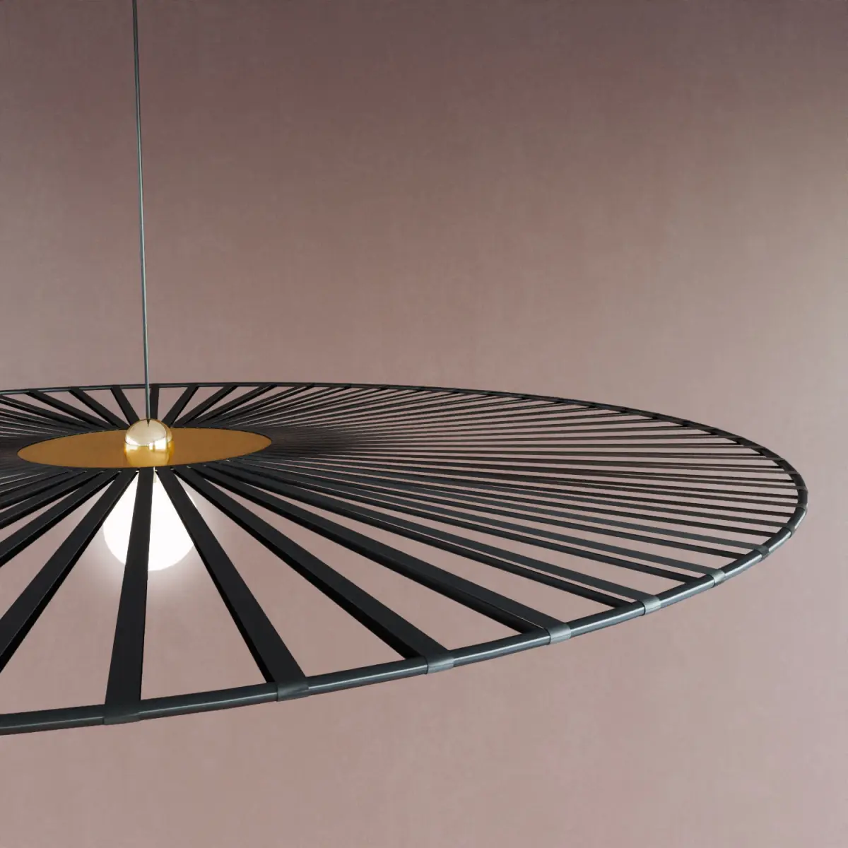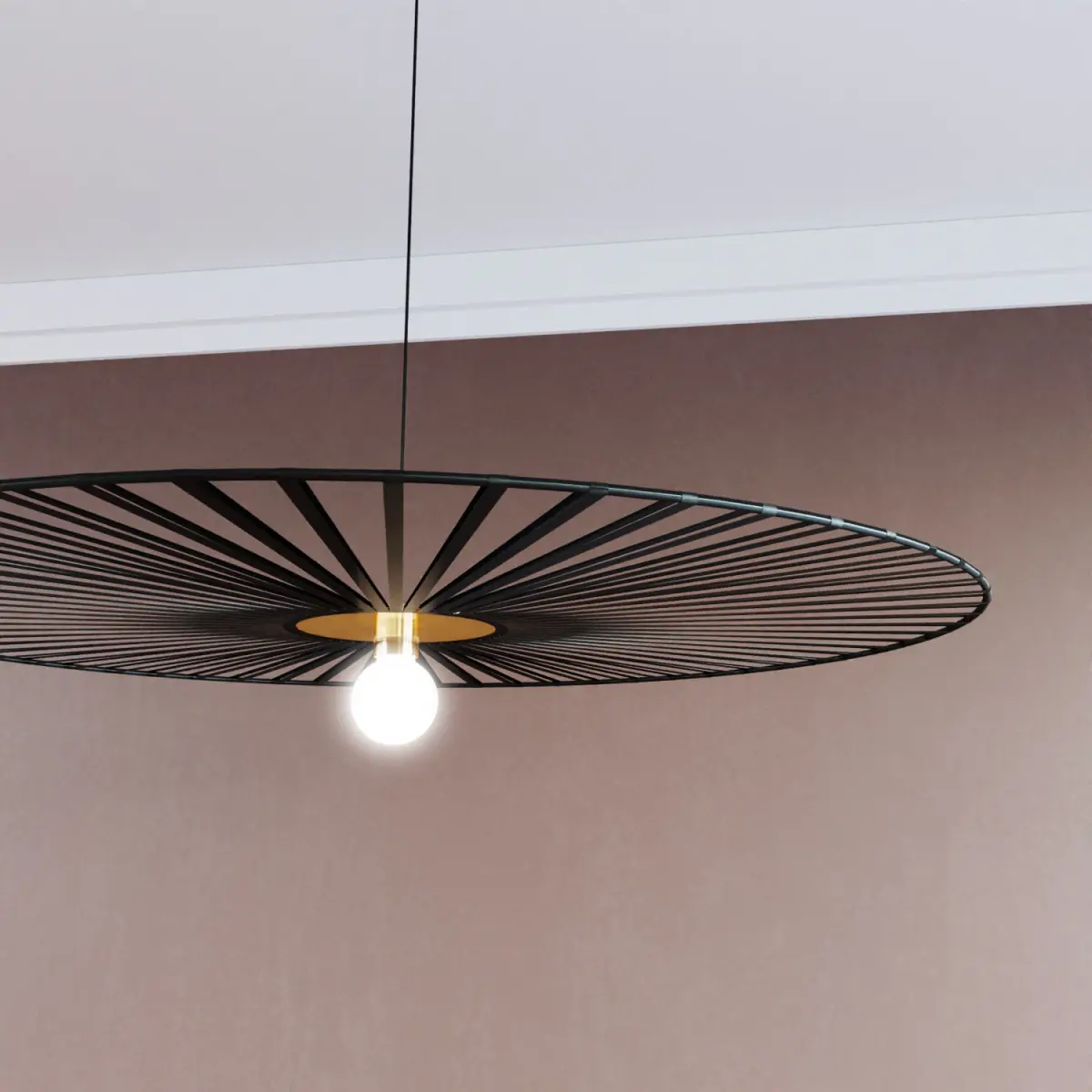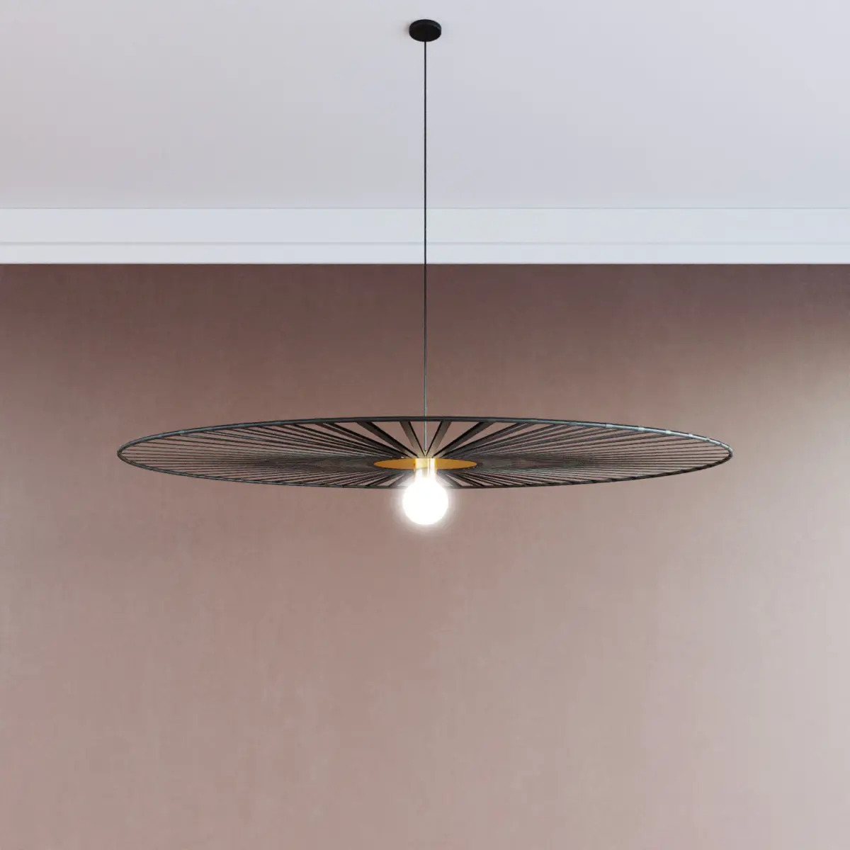 In the center of this suspension, at the level of the socket, a satin golden brass plate supports the black ribbon diffuser. In the center, a globe shaped bulb preferably comes to bring an elegant aesthetic rendering, like a spherical glassware. The golden brass metal plate brings a warm and trendy rendering to this suspension.