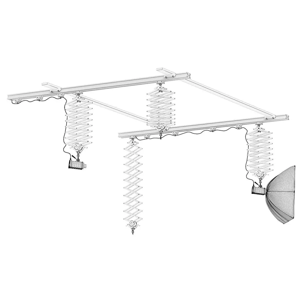 Photo studio ceiling rail system 3d model with a lamp and a softbox. Compatible with 3ds max 2010 (V-Ray, Mental Ray, Corona) or higher, Cinema 4D R15 (V-Ray, Advanced Renderer), Unreal Engine, FBX and OBJ.