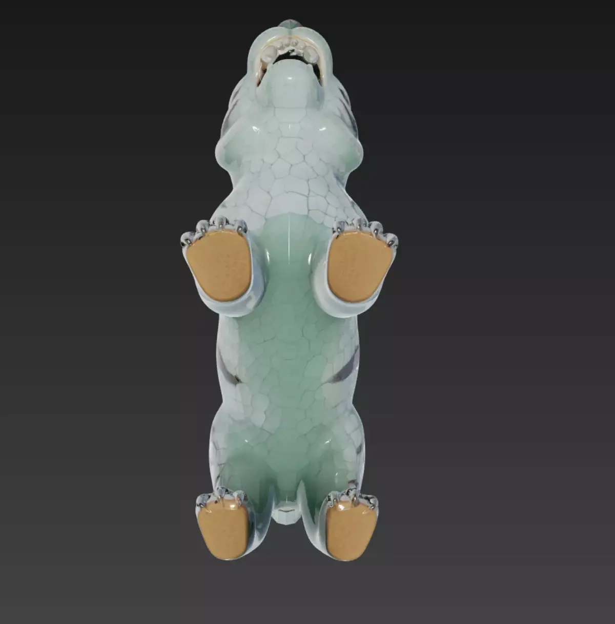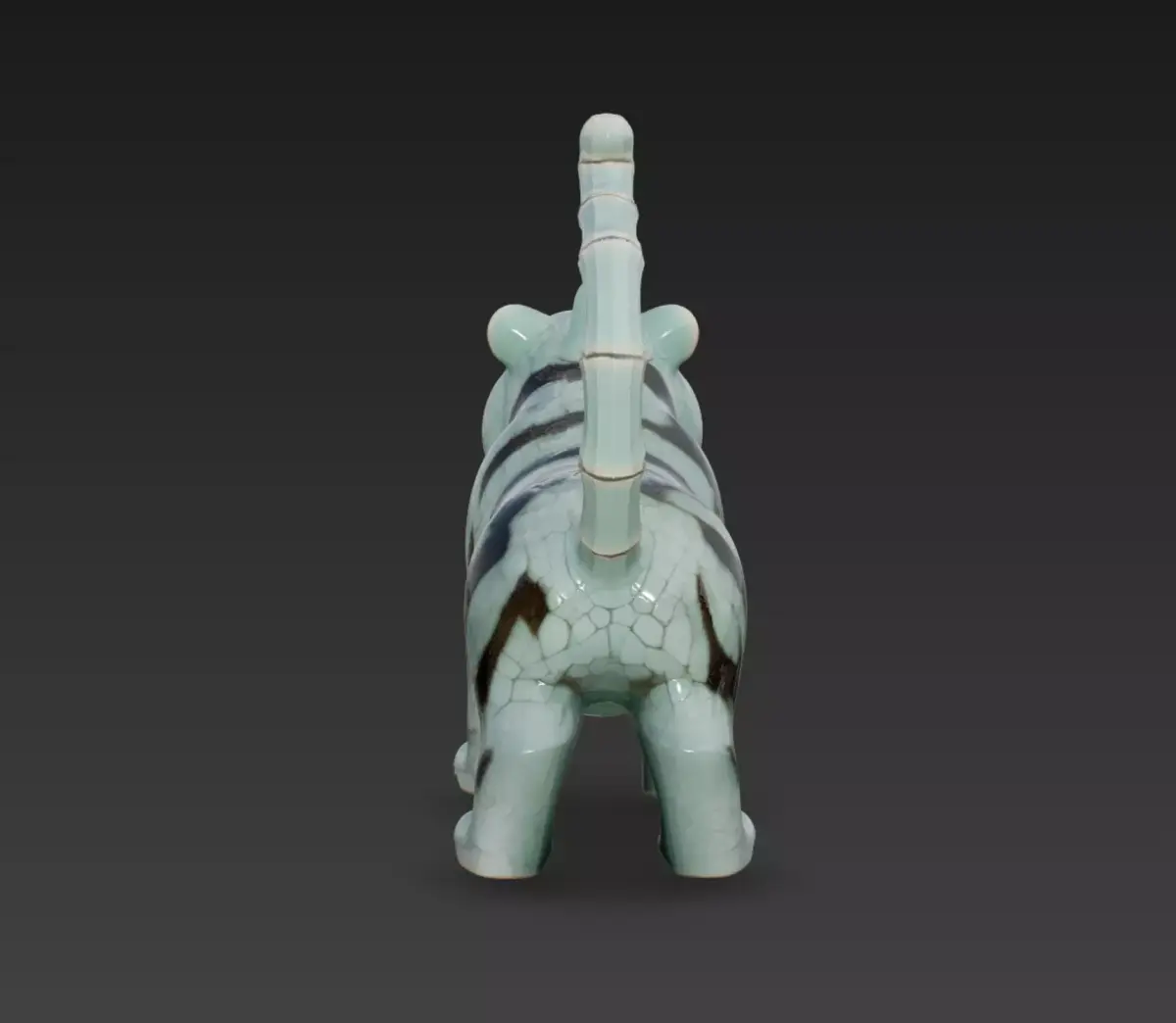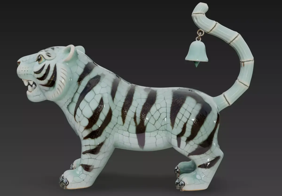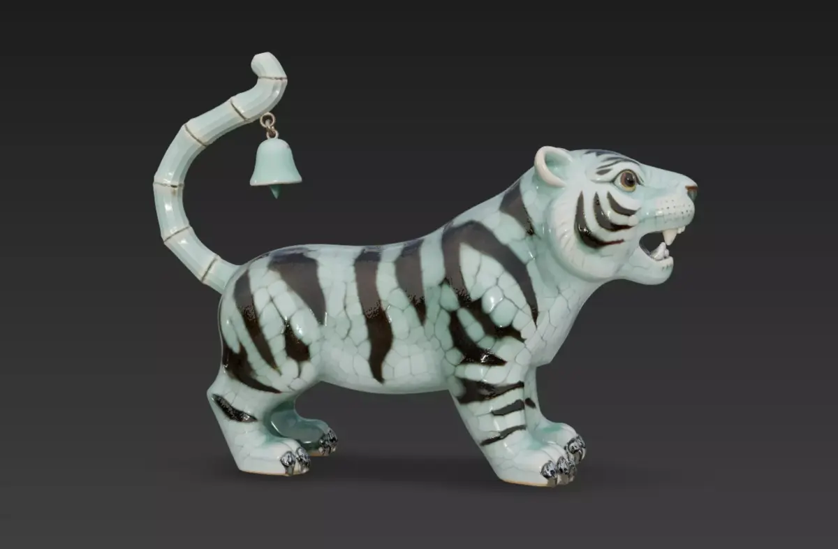 This model captures the charm and personality of a hand-crafted celadon tiger figurine, blending traditional ceramic aesthetics with a stylized, almost mythical character design. The glossy crackle-glaze surface, smooth contours, and engraved striping give it the feel of a premium artisan sculpture you’d find in a gallery or cultural museum.