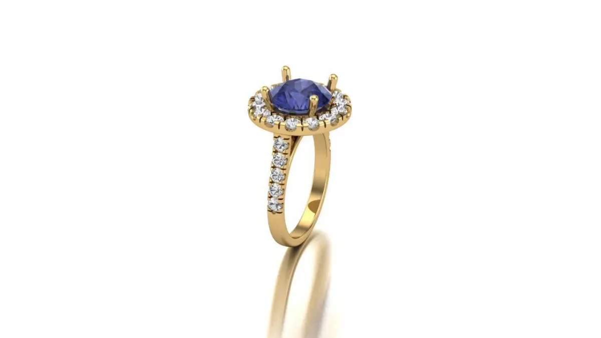A Celestial Aura: The Round Tanzanite Halo Diamond Ring in 14k Yellow Gold