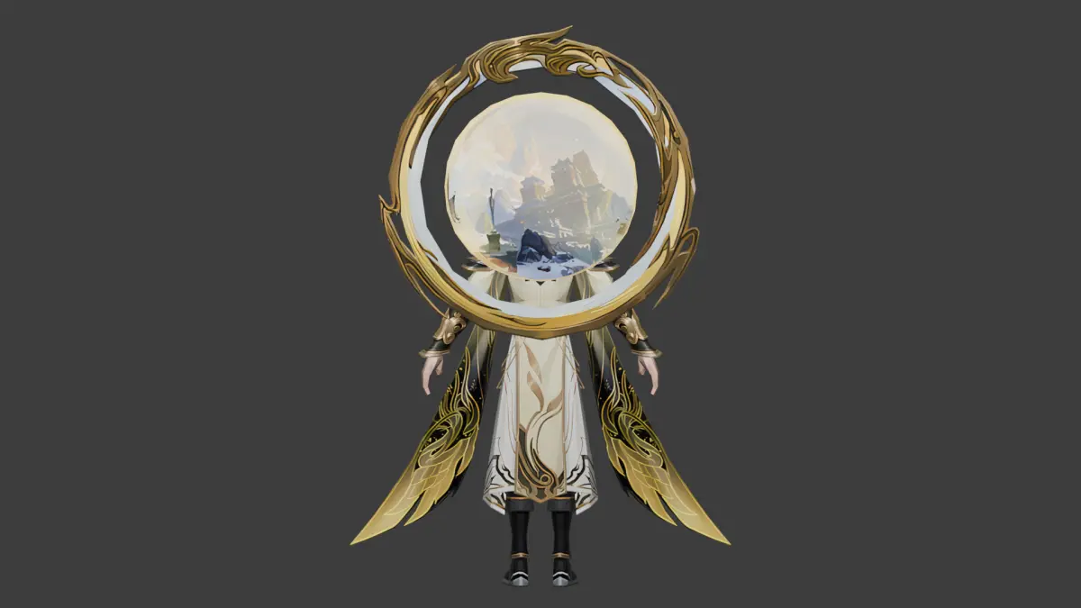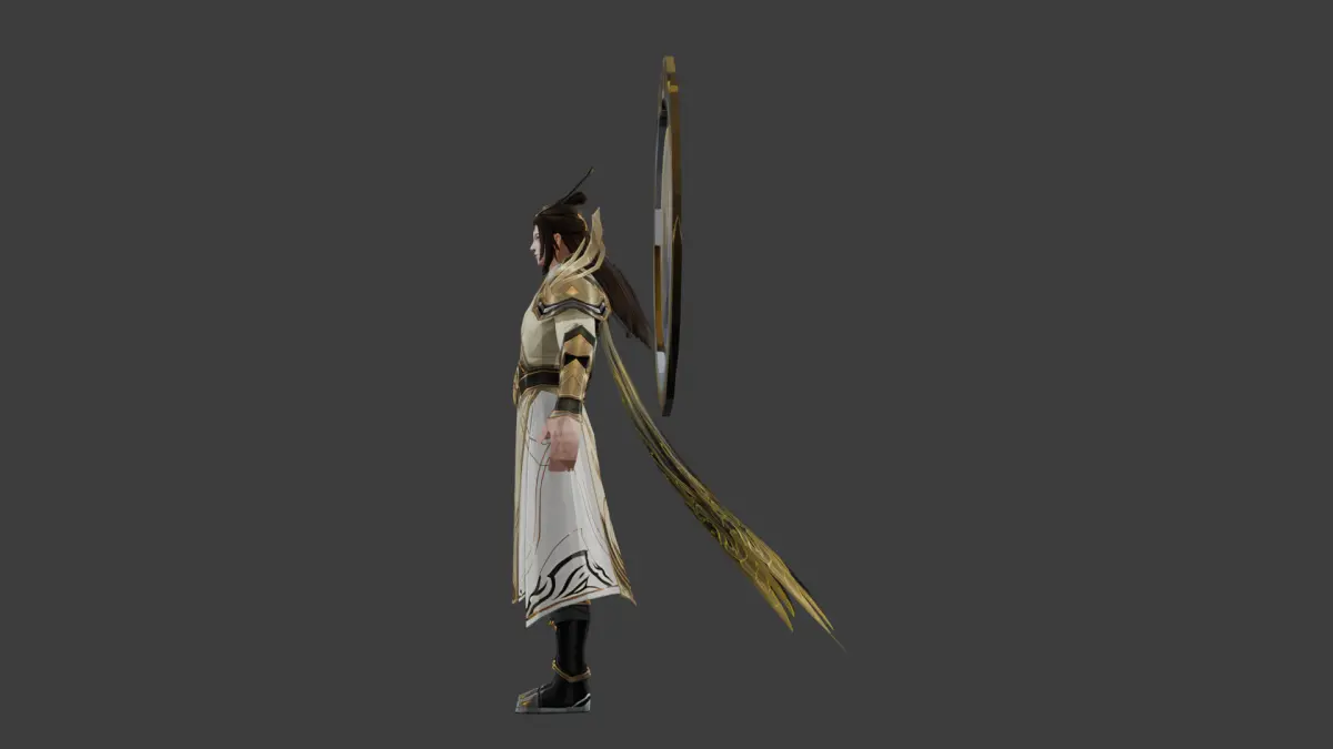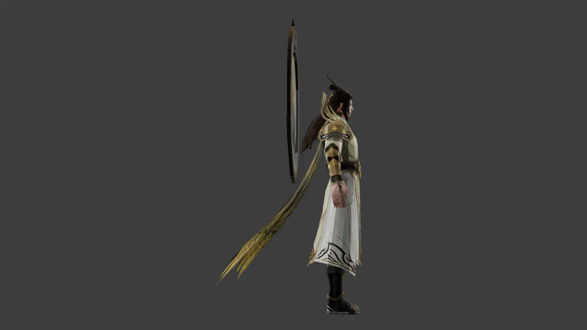 This highly detailed stylized male character features a mystical celestial design with white and gold robes, intricate armor-like elements, and an ornate halo-like structure. Ideal for fantasy or mythological RPGs, this character can serve as a wise sage, high priest, or divine protector.