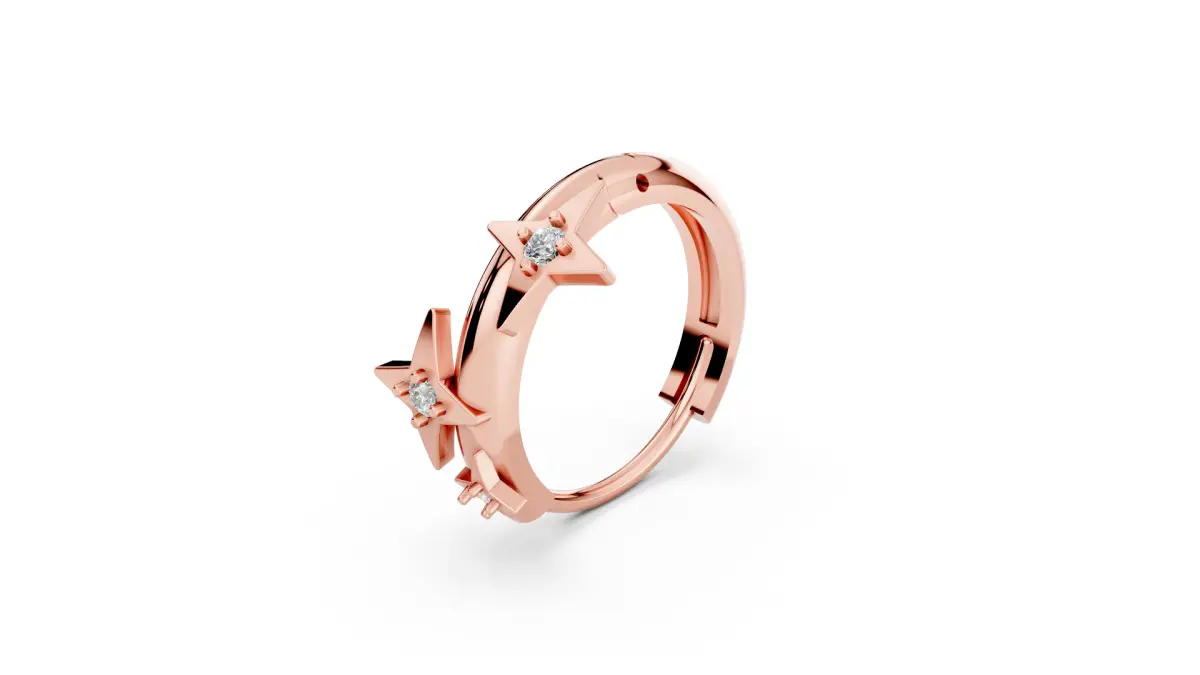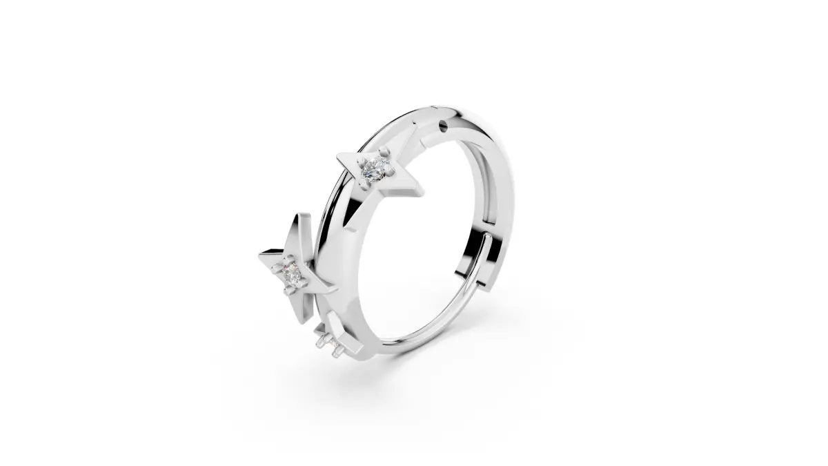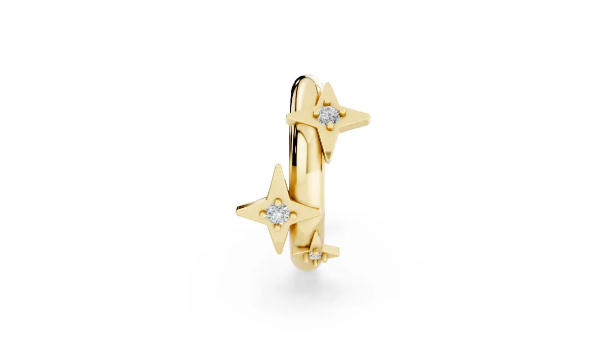 The Celestial Star Bali Hoop with Blue Diamonds is a beautifully crafted earring that blends traditional Bali design elements with a modern, celestial twist. This 3D model showcases a classic circular hoop, adorned with three star-shaped motifs, each set with sparkling blue diamonds, creating a unique and eye-catching piece.