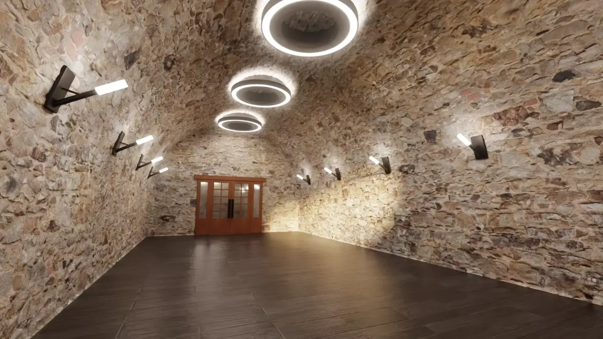 An underground cellar interior built around a clear rectangular layout and vaulted stone architecture. The scene combines masonry walls, arched ceilings, modern lighting fixtures, and a refined wooden floor, creating a balanced environment that feels architectural and spatially grounded. The space is designed as a neutral foundation for custom props and storytelling, making it suitable for winery scenes, historical interiors, cinematic setups, and architectural visualization.