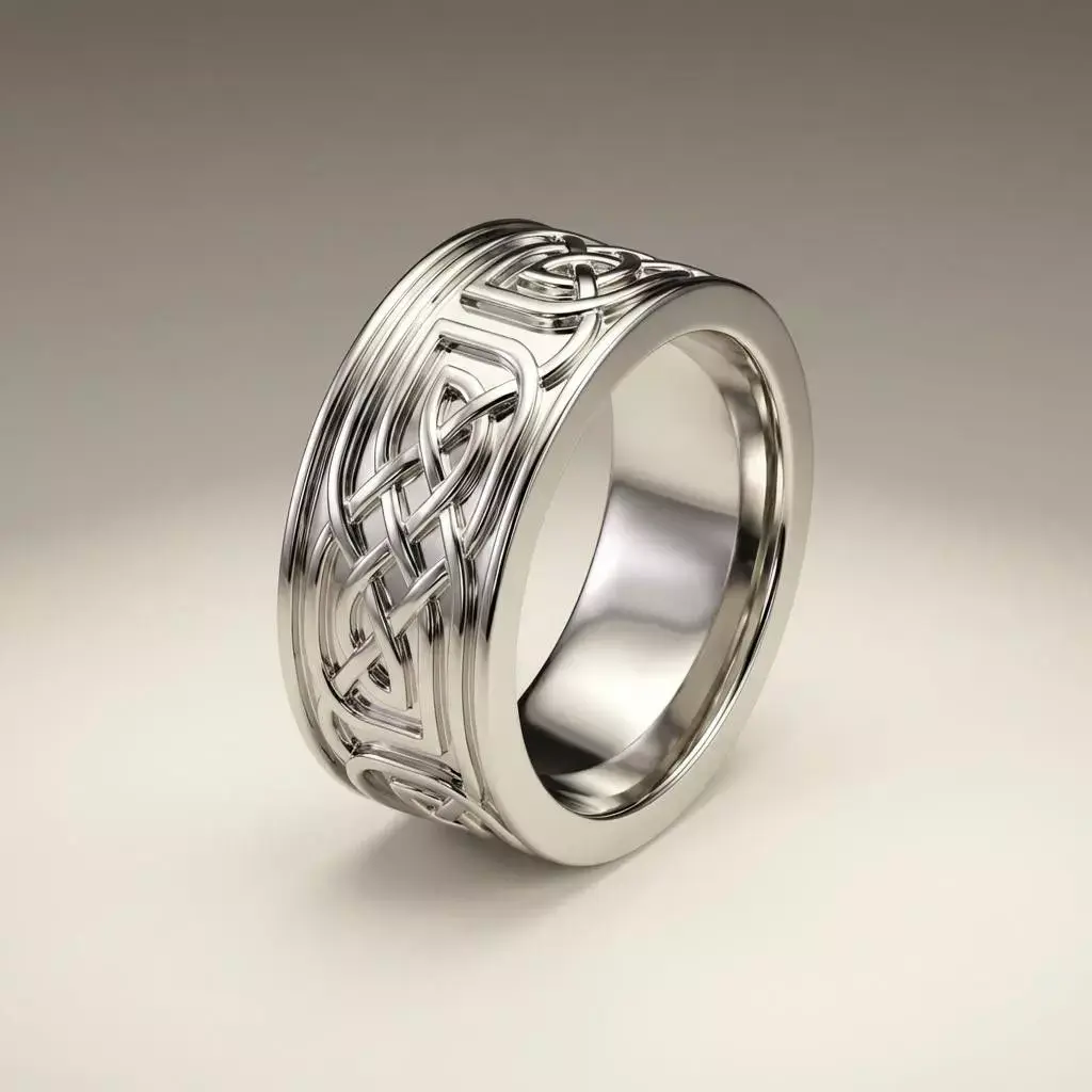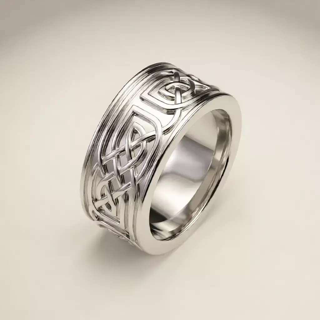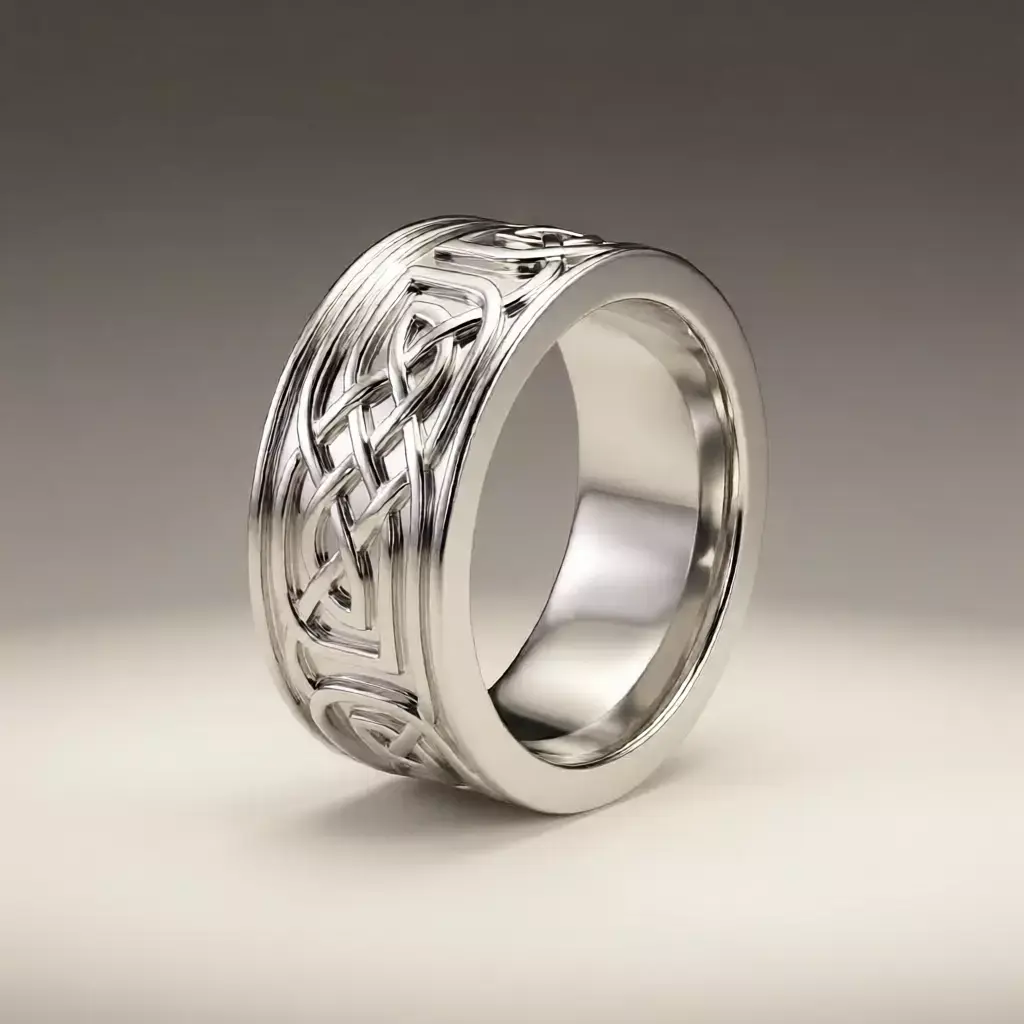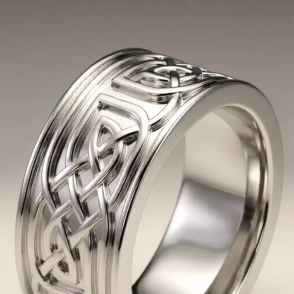Elegant Celtic knot ring featuring an intricate interwoven pattern symbolizing eternity, unity, and continuity. The design blends traditional Celtic ornamentation with a modern, clean band structure, creating a timeless piece suitable for both everyday wear and statement jewelry.