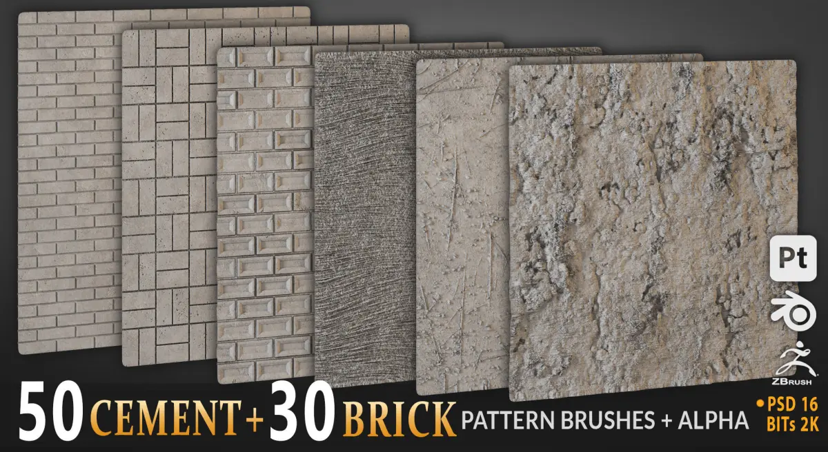 50 Cement pattern brushes + Alphas (PSD).30 Brick Pattern brushes + Alphas (PSD).Jpeg files (as preview).