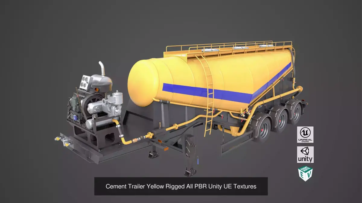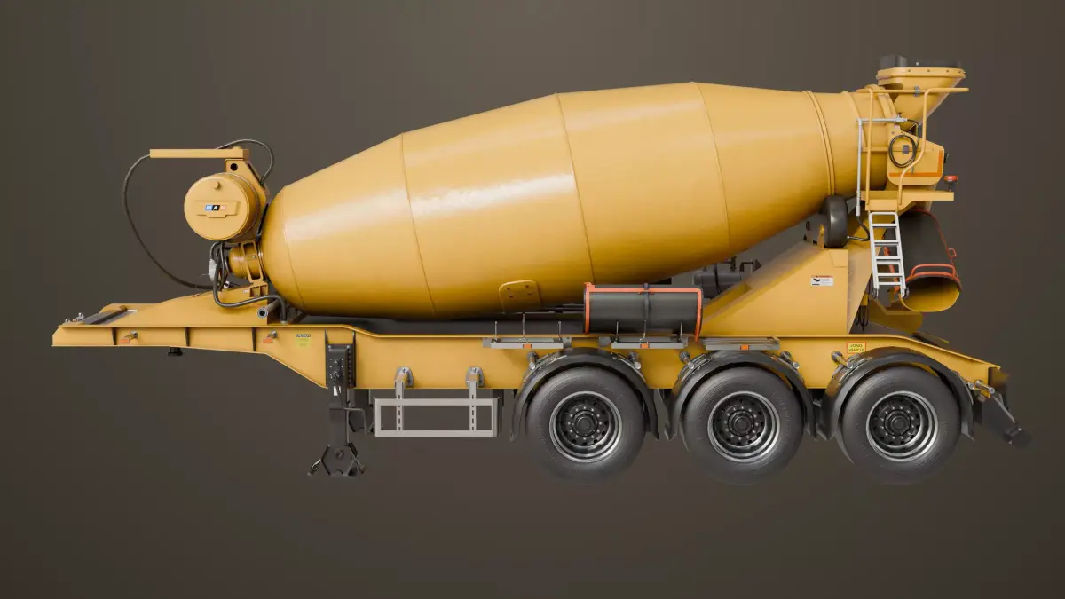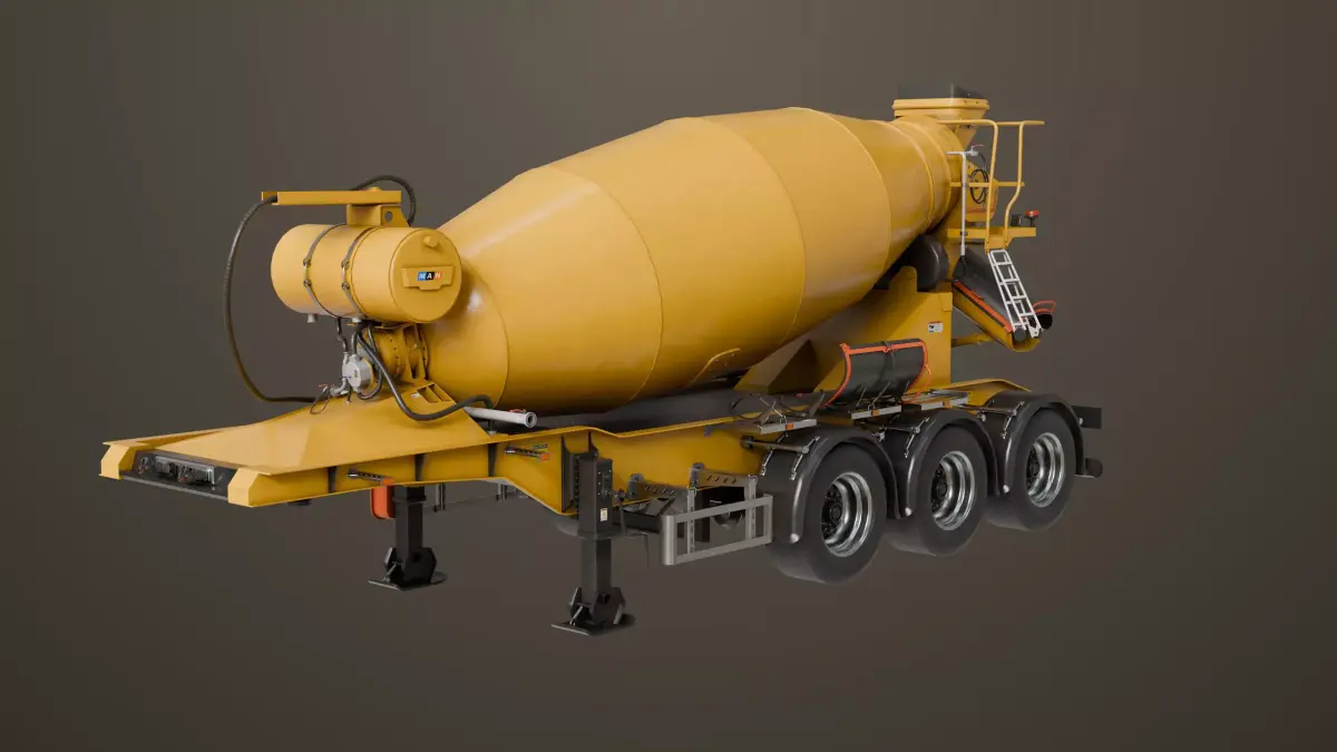 The Photorealistic 3D model of Cement Mixer and Trailer Yellow Rigged. This model is suitable for any visual production - broadcast, high-res film close-ups, advertising, games, design visualization, forensic presentation, etc,.