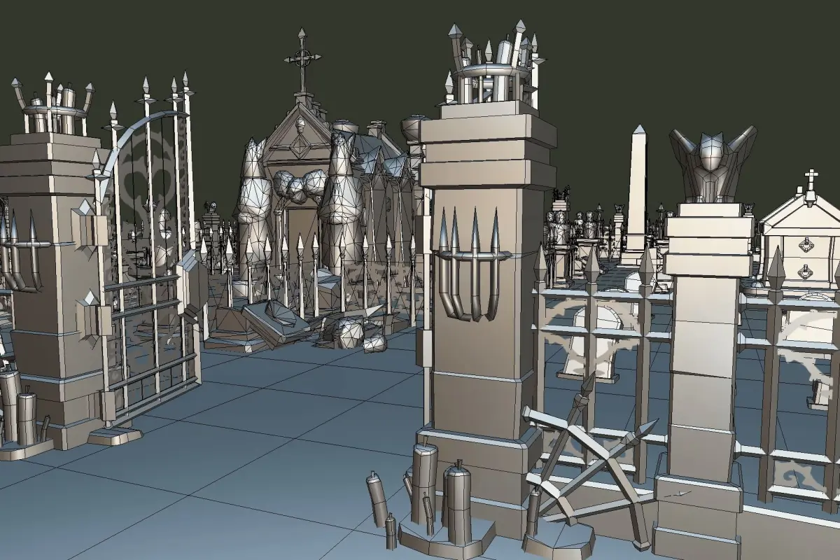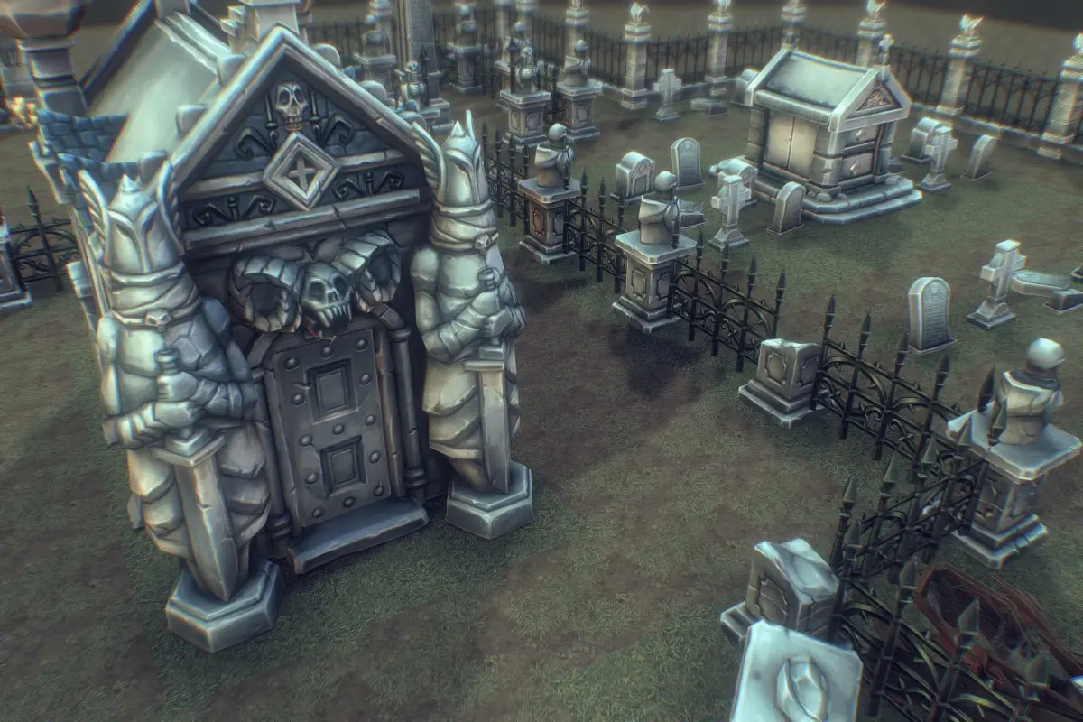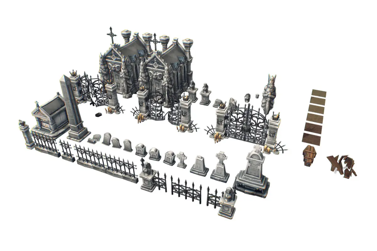 Contained in this pack are:6 unique grave stones4 floor textures1 tomb1 obeliks1 coffin1 coffin broken1 gate with animations1 broken gate with animation1 crypt1 fence tile1 destructible plinth with statue1 plinth with statue1 fence corner stone left1 fence corner stone right1 statue body fragment1 statue head fragmentsome fence elementsI will be updating this package periodically as I complete new modules so be sure to check by again from time to time or visit my website for updates.