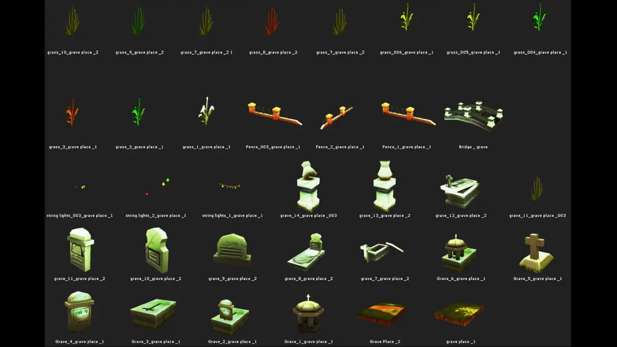 This is a cartoon cemetery, More than 33 + models : grave , grass, place, fence, bridge. lighting....