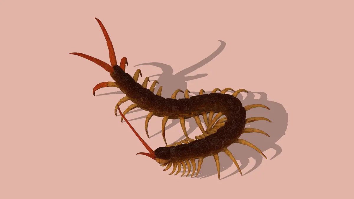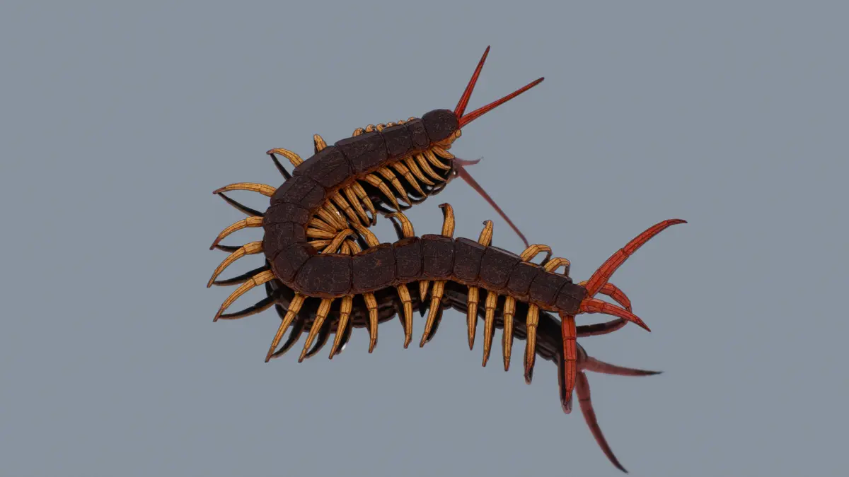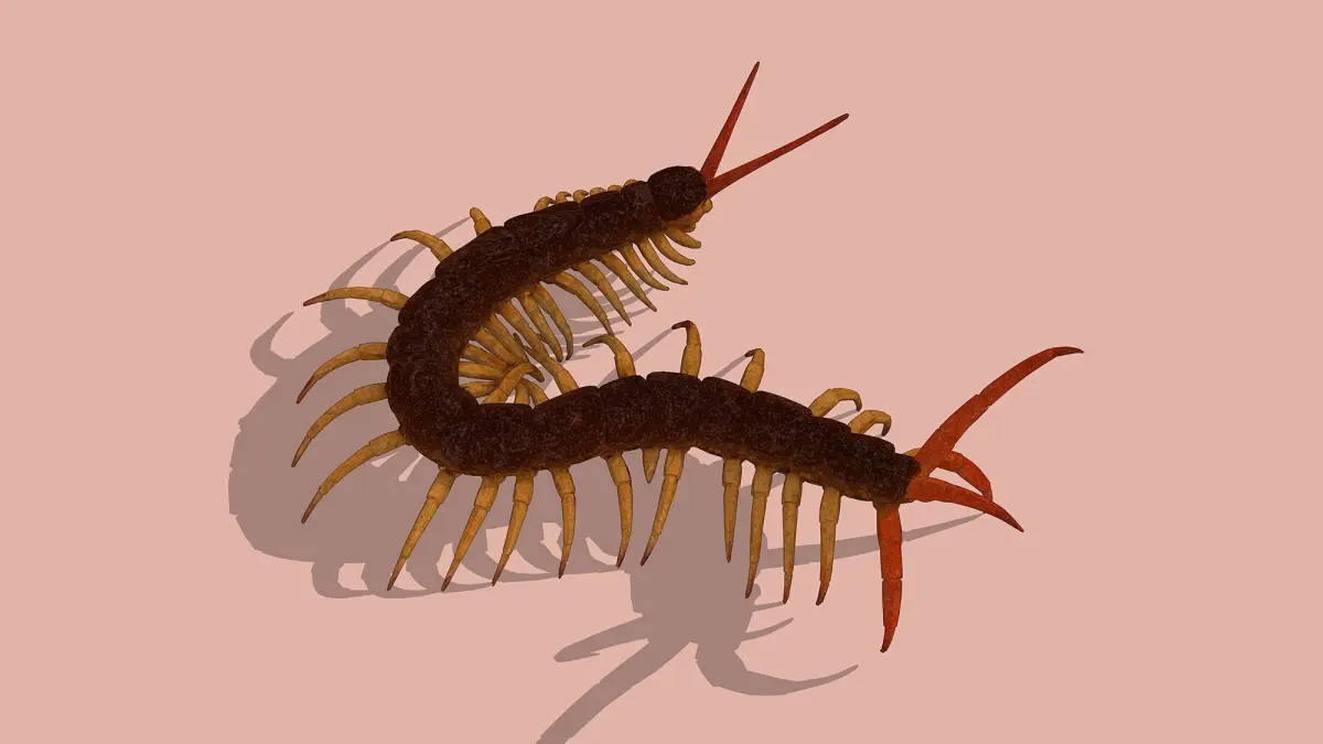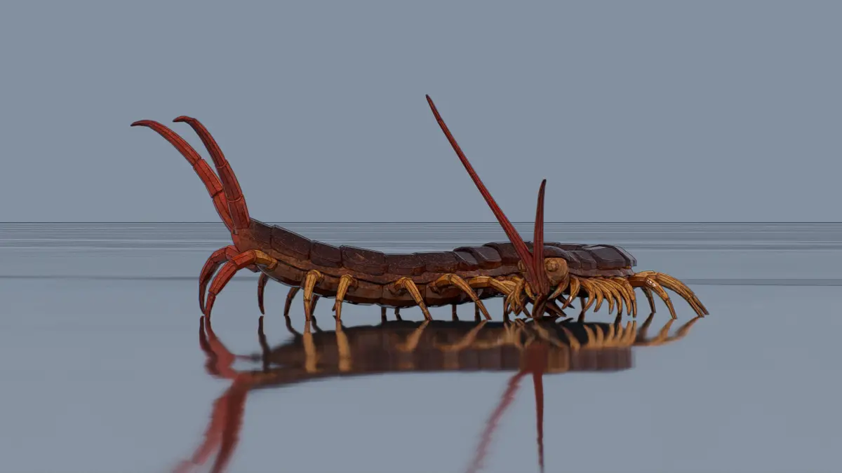 This 3D low-poly model portrays a detailed centipede with a segmented, dark brown body and numerous orange legs. The design features exaggerated red antennae and a coiled posture, making it suitable for games or educational tools. Its low-poly structure ensures efficient performance while preserving a striking, insect-like appearance.