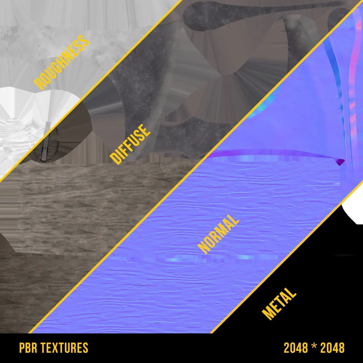 - PBR Materials: Base colour, Roughness, Metal, Normal, Occlusion