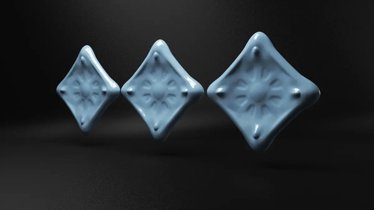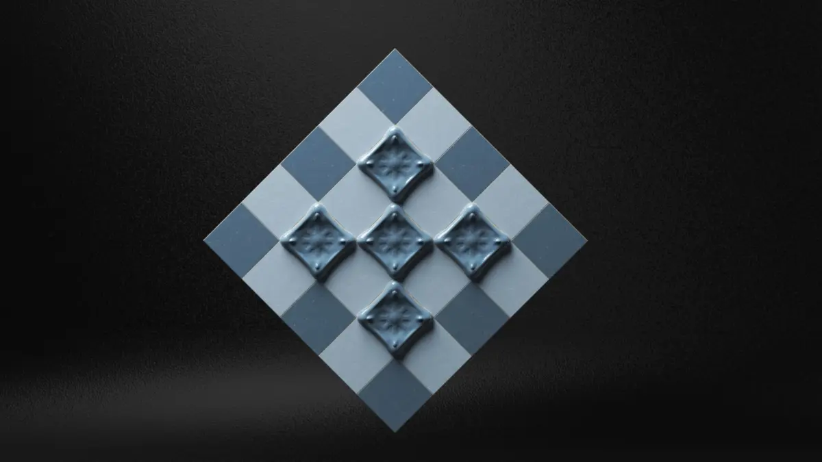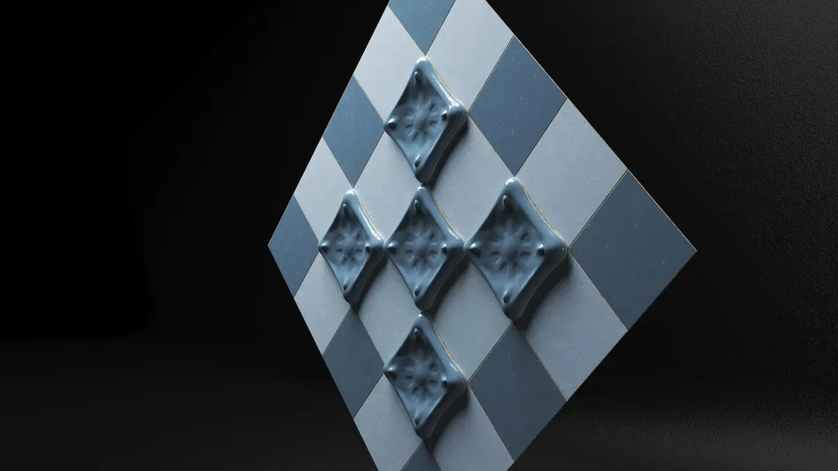 This is one of the iconic architectural elements of Gaudi's famous building in Barcelona, la Casa Batllo.A square shaped 3D model of a ceramic tile, in blue colour, duplicated all along the building's interior, recreated as faithfully as possible using various visual references