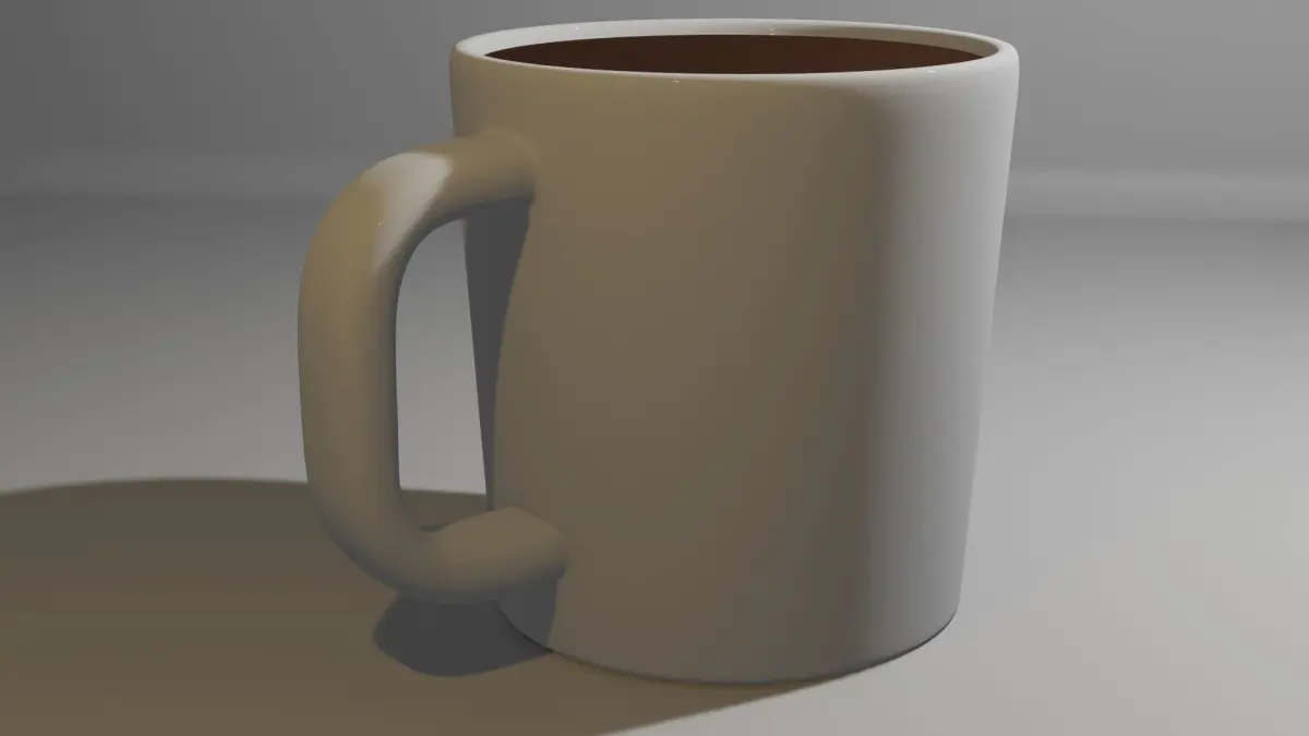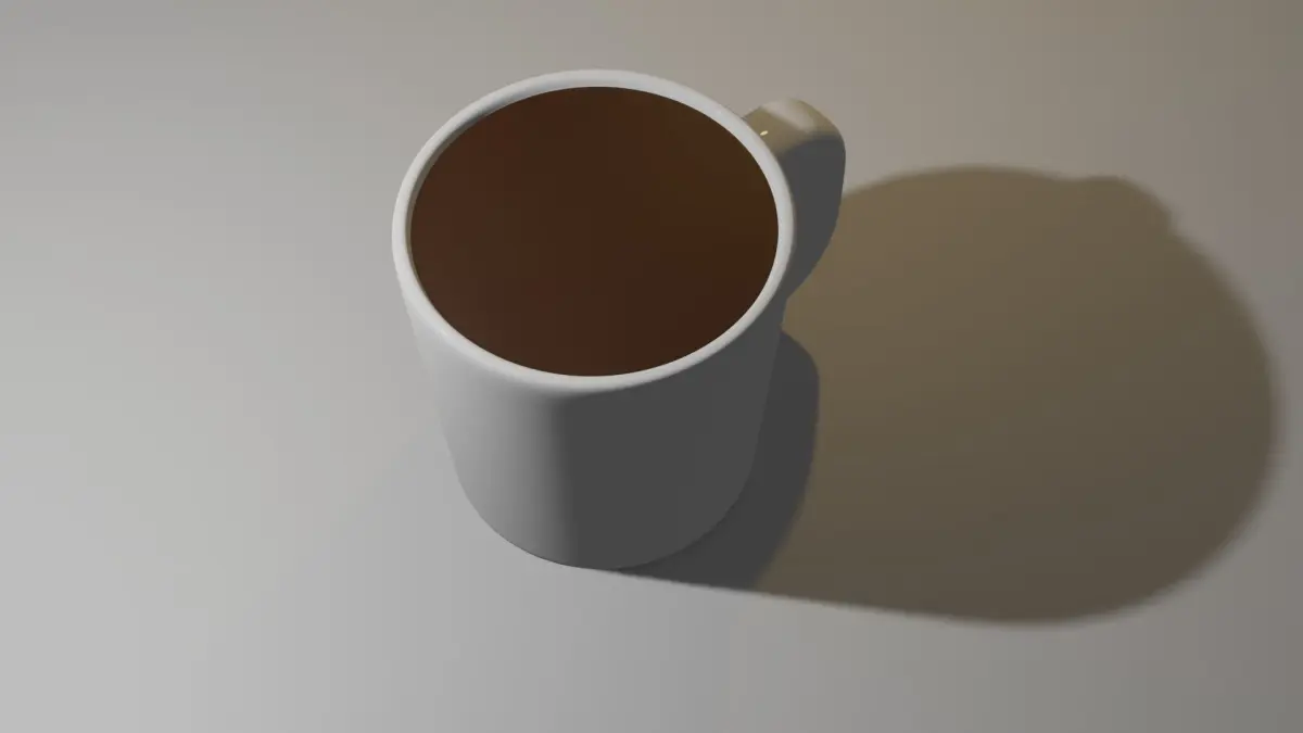 This is a detailed 3D model of a ceramic coffee cup, crafted in Blender and rendered with the Eevee engine. The cup features a smooth, glossy finish with subtle curves that give it a modern and elegant look. Inside, the cup is filled with rich, dark coffee, with a slight reflection on the surface to enhance realism.