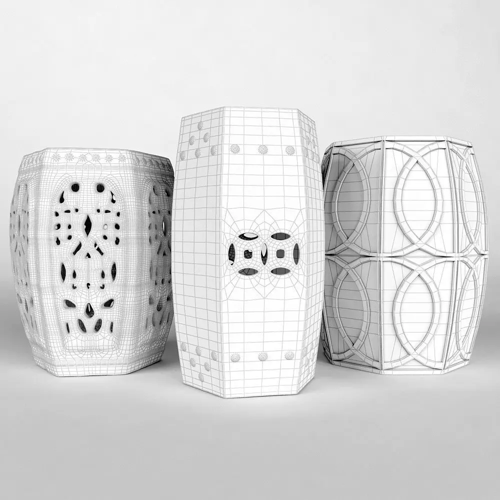 1) Green Apple Modern Asian Garden Seat Bunching - 6k polys2) Hexagon Pierced Ceramic Garden Stool- Cinnabar Brown Red Rust Glaze - 62k polys3) Modern Coastal Beach Bright Orange Treillage Garden Seat Stool - 9k polys