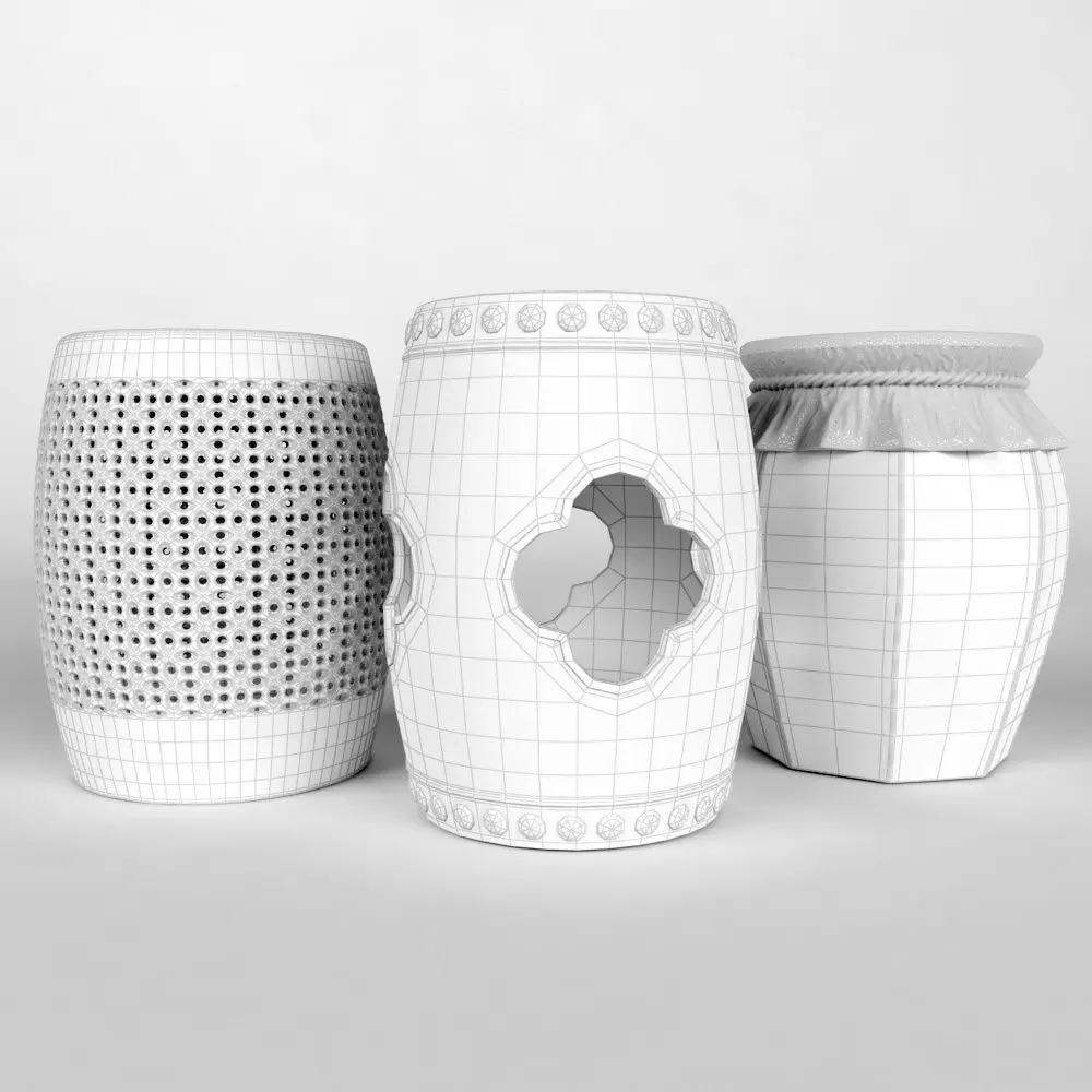 1) Gao Global Bazaar Floral White Porcelain Stool Side Table - 5k polys2) Thelma Hollywood Regency White Porcelain Jar Stool - 56k polys3) Sami Global Bazaar White Porcelain Lace Garden Stool - 53k polys