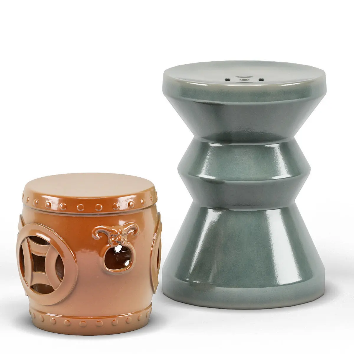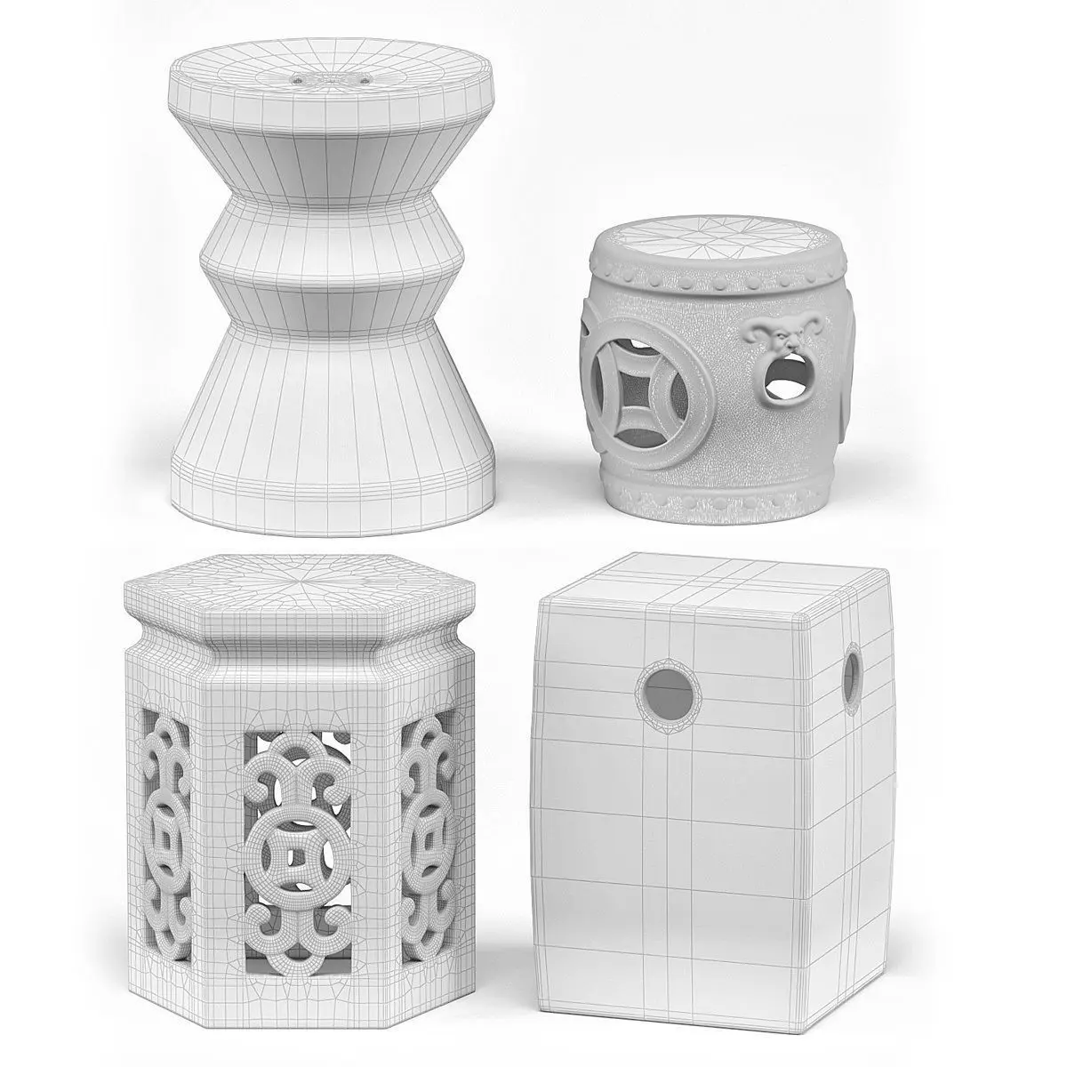 1) Koji Bazaar Green Glazed Square Ceramic Garden Stool (18H x 12.5W x 12.5D) - 4k polys2) Chinese Ocean Blue Ceramic Cutout Garden Stool (15H x 13W x 18D) - 13k polys3) Farr Garden Stool (14.3W x 14.3D x 19H) - 2k polys4) Double Fortune Tangerine Orange Pierced Asian Garden Seat Stool (11.5H x 12W x 12D) - 250k polys