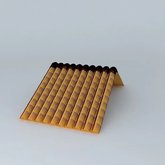 Over lapping orange ceramic roof tiles with roof peak connectors.