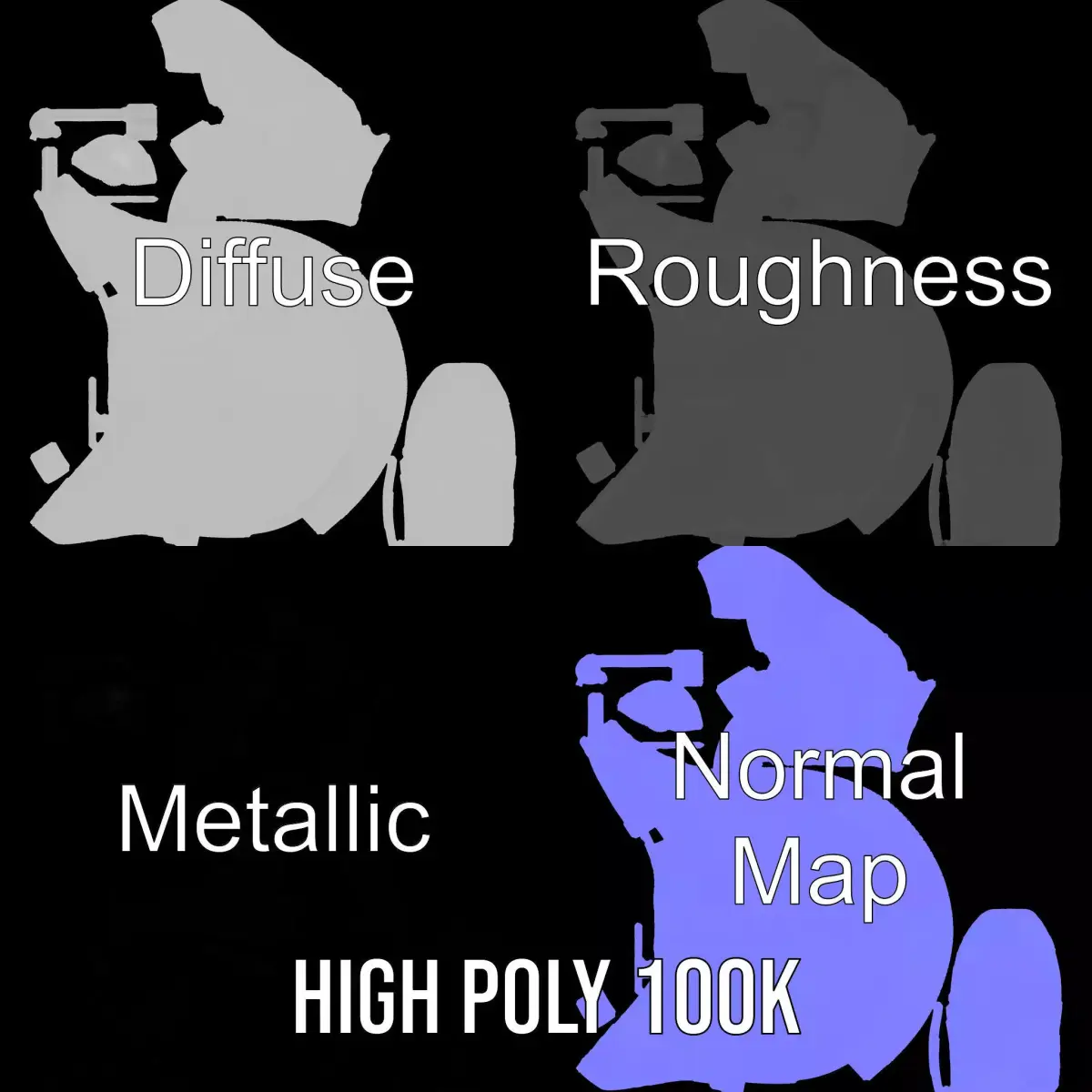 The model's textures are PBR, Diffuse, NormalMap, and reflection/roughness/metallic, which are suitable for any modern rendering engine.