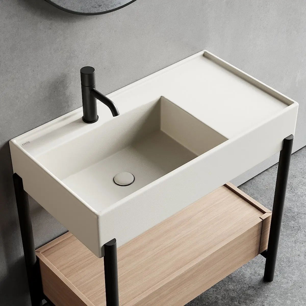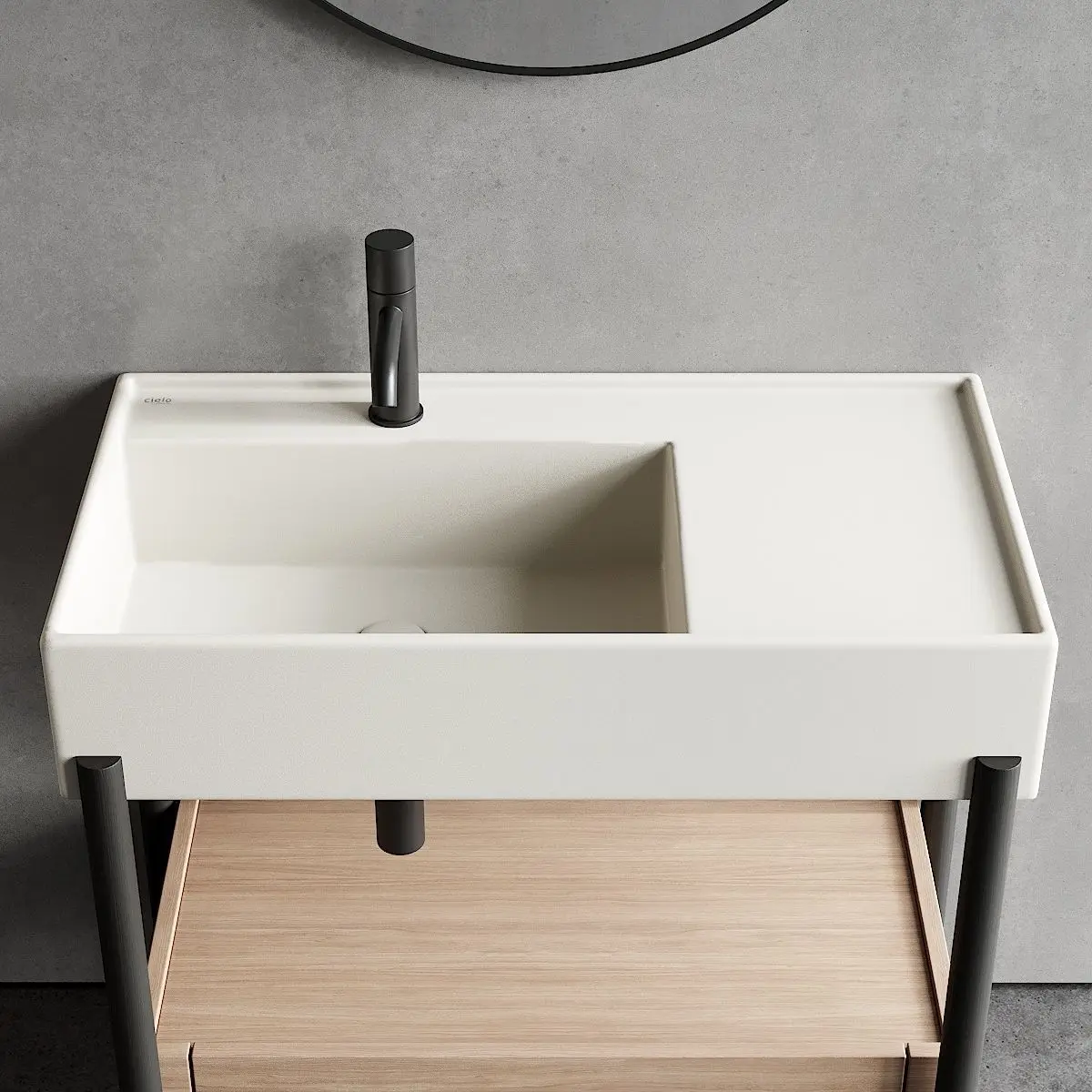 Collection - PlinioType - Rectangular ceramic washbasin with integrated countertopMaterials - Wood, CeramicDesigners - Andrea Parisio, Giuseppe PezzanoManufacture year - 2018