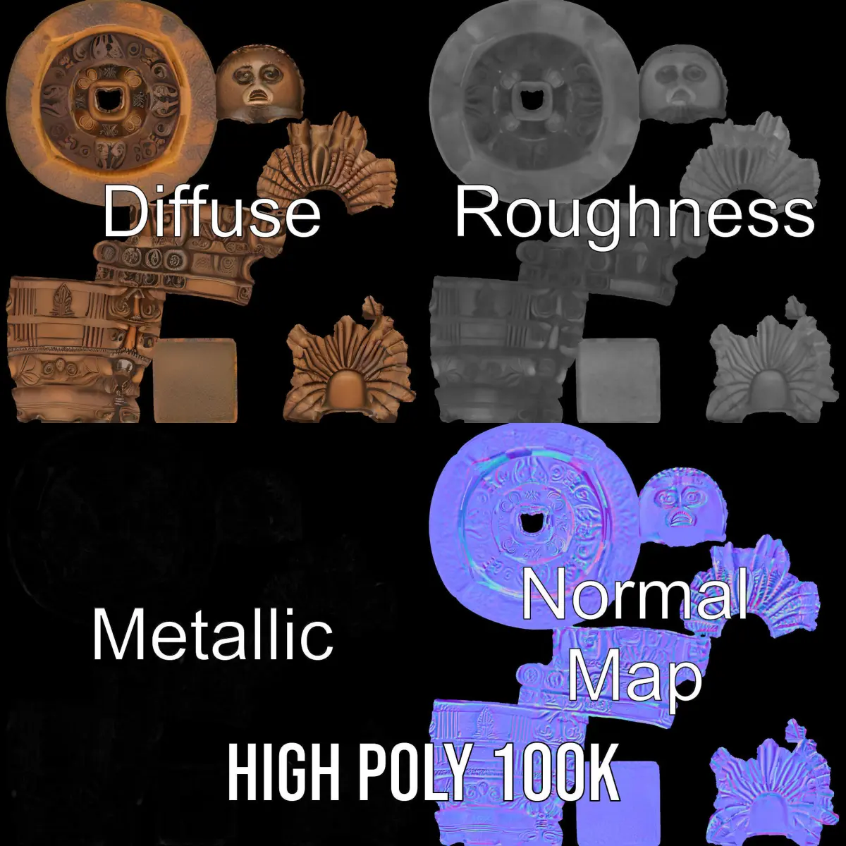 This ceremonial totem pole 3D model pack offers a beautifully detailed representation with cultural symbolism, ideal for use in historical simulations, games, and educational projects. Each model has 3 levels of detail: low-poly (1000 triangles for mobile), middle-poly (10,000 triangles for environment), and high-poly (100,000 triangles), which allows for the use of this model in production rendering (such as 3ds Max, Maya, Cinema4D, Blender, Vray/Corona/Cycles, and all others), game engines (Unity and Unreal compatible), and interactive presentations, providing a choice of detail based on the LOD System principle. The model's textures are PBR, Diffuse, NormalMap, and reflection/roughness/metallic, suitable for any modern rendering engine. All models accurately unwrapped with no overlapping UV. Textures are 4096x4096 in size. The first image is the reference used for creating the 3D model. It is important to carefully evaluate the quality of the model by examining the preview images that display the topology and polygonal mesh. These previews (WIRE and WEB 3D Preview) clearly demonstrate how accurately the model matches the original reference and how well the geometry has been executed. Please like and leave a comment for the model if you liked it.