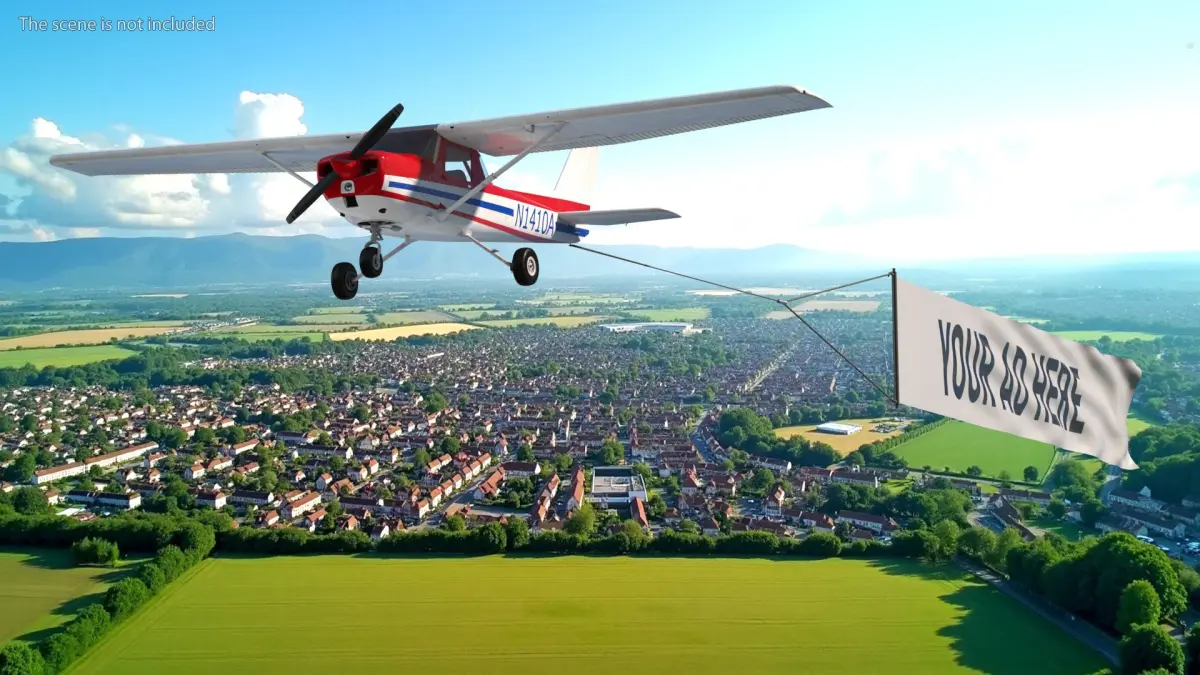 Cessna 150 Aircraft with Advertising Air Banner is a three-dimensional model of advertising aerial banner mock-up that is an airplane-towed banner, representing a large-scale promotional display designed for aerial advertising.