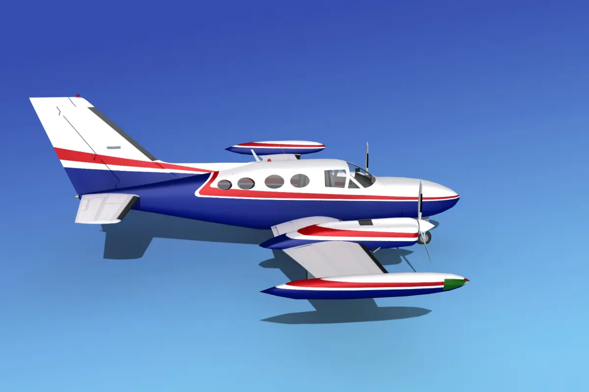 This model is built near to scale within a few inches of actual general dimensions in detail and fully textured. It hasmany animatable features including flaps, elevators, rudder, ailerons,propellers, landing gear and doors. The cockpit is viewable from the exterior showing detail. The interior cabinseating is also included. This model is also available in a wide range of formats . The Cessna 421 Golden Eagle is a further development of theearlier Cessna 411. It is a light twin-engine personal civilian transport aircraft. The Cessna 421 has seating for 6 passengers and crew. It can be flown by one or two crew members. The Cessna 421 uses Continental GTSIO-520-D engines. The propeller isgeared to reduce rpm off the crankshaft of the engines. The 421 a models were produced beginning in1967 and was redesigned and marketed in 1970 as the 421B. Some 421s were modified to accept the turboprop engines which made them very much like the Cessna 425.