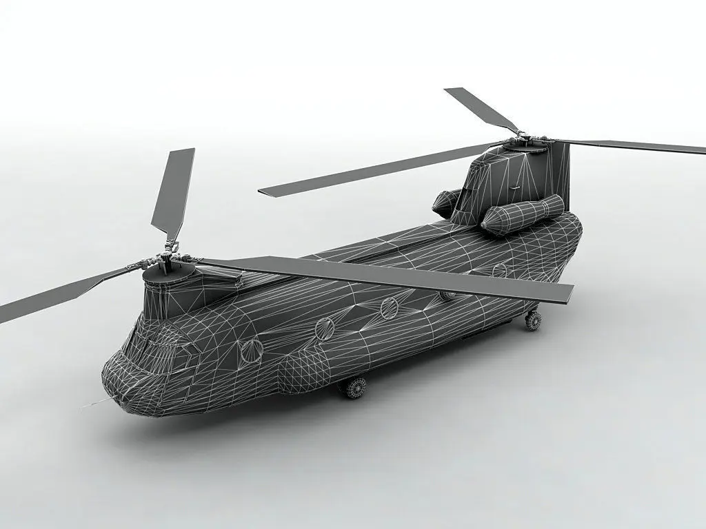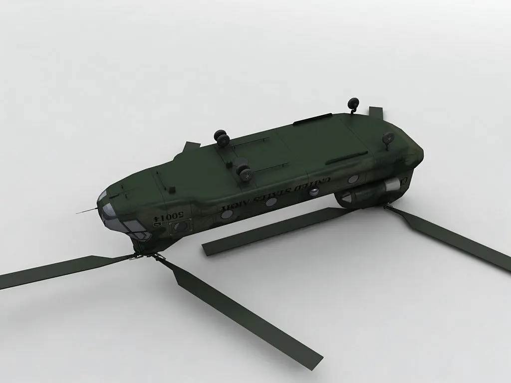 CH47 Chinook Helicopter (Exterior only) This is a low detail model designed to scale from blueprints. Although all the major dimensions are correct (length, height, width, wingspan etc.) every exact arc and measurement is not taken into account for engineering purposes. This model is best suited for entertainment and multimedia.