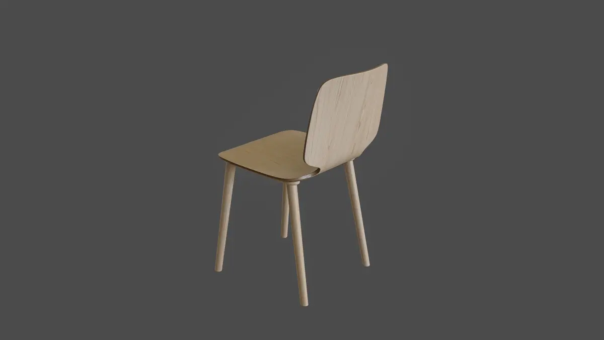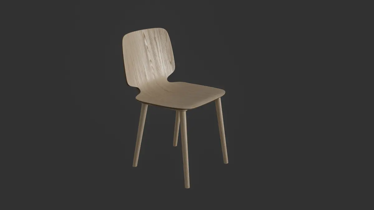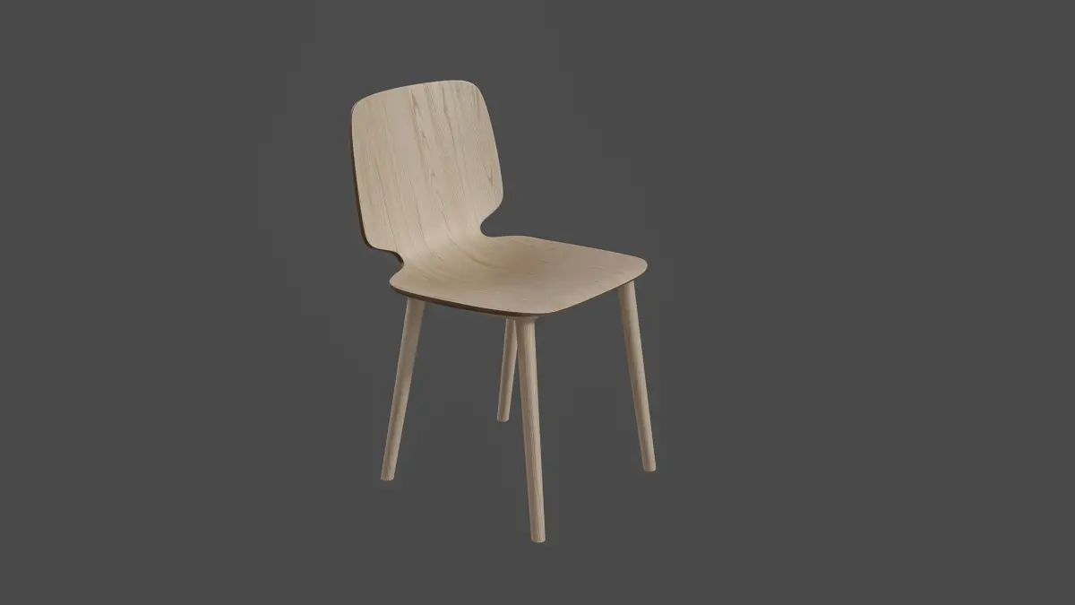 Modern, minimalist wooden chair with a light wood finish. The chair features a curved backrest and a wide seat, both crafted from a single piece of wood. The chair stands on four slender, tapered legs that splay outward slightly.Properly UVW unwrapped, textures included, quad topology