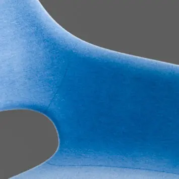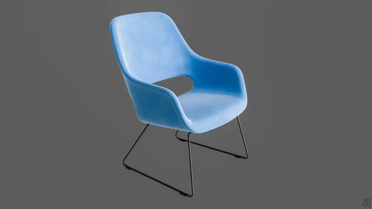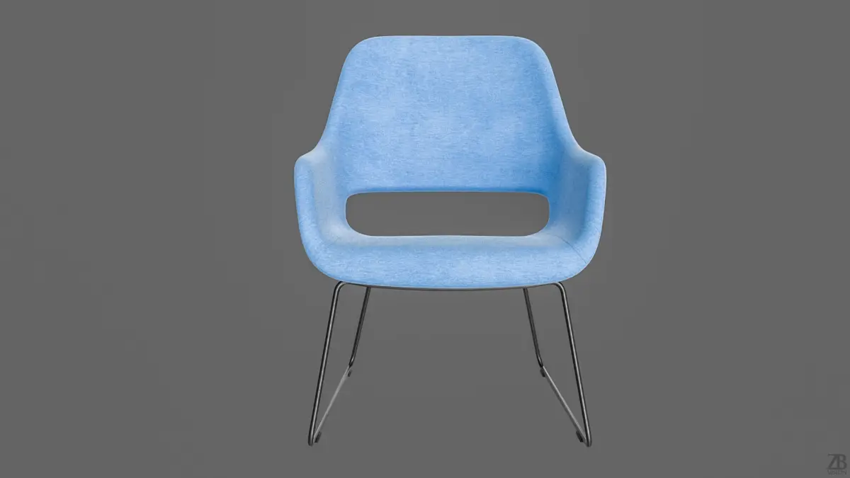 3D model of a modern armchair. The chair features a smooth, curved seat and back, upholstered in a light blue fabric. The chair stands on four slender, straight legs that are black metal also called sledge. The overall aesthetic is one of understated elegance and contemporary design. Clean UVs, quad topology, texture included.