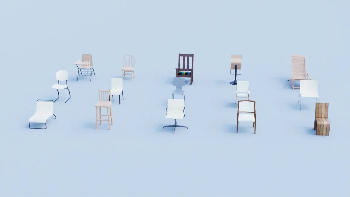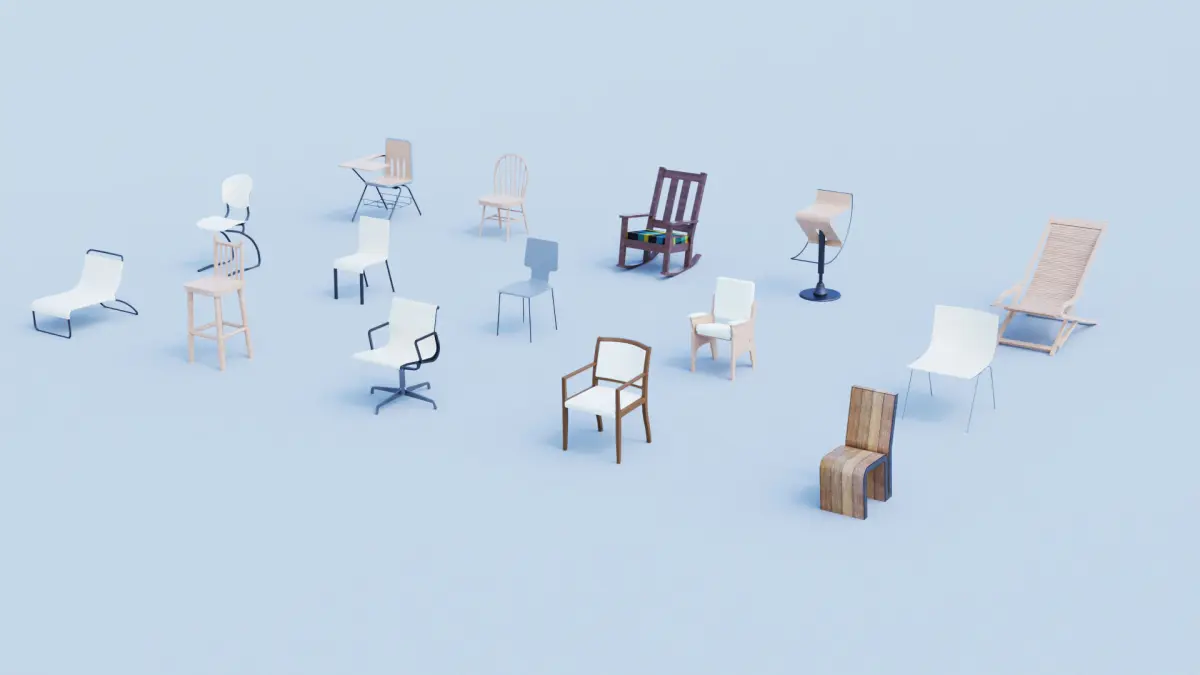 This collection includes 15 ndoor and outdoor chair models, perfect for architectural visualization, interior design projects, gaming environments, and more. The chair types range from normal chairs, bar chair, lounge chair, arm chair, office chair, rocking chair, and outdoor chairs.