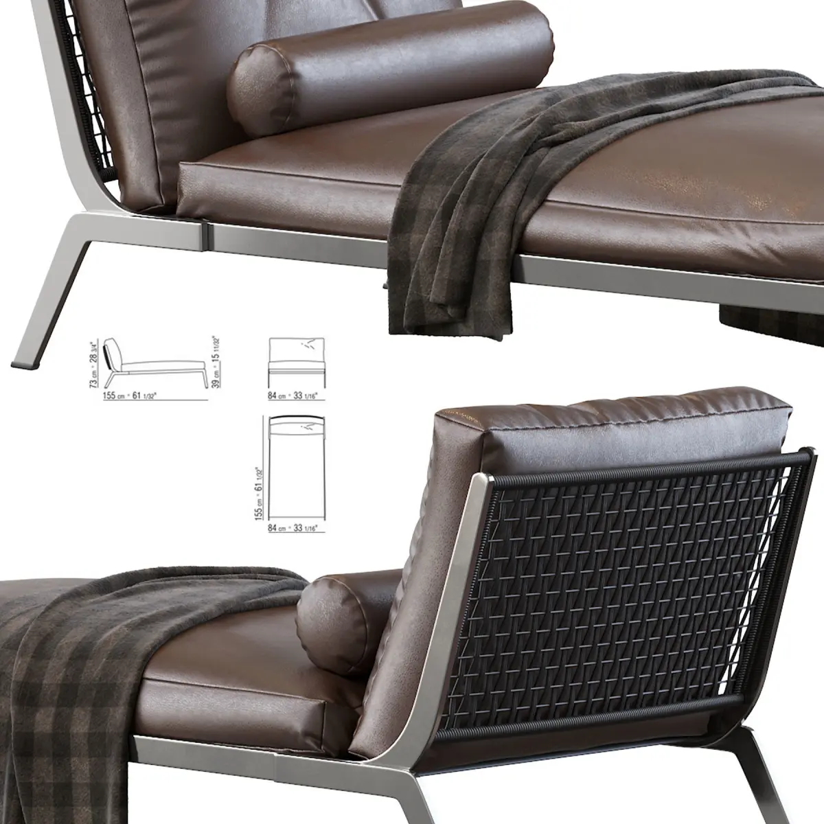 PIPING – THE GROSGRAIN PIPING IS AVAILABLE IN ALL THE COLORS ON THE SAMPLE BOARD, FOR BOTH FABRIC AND LEATHER COVERS.Like its namesake sofa, the Happy chaise longue is an expression of great formal elegance. Its unique seat back is made up of a metal frame embellished with a sophisticated and entirely hand-woven open-weave design made with cowhide cord. The soft, goose-down-filled seat and seat back cushions offer striking visual contrast to the understated yet elegant metal structure. The couture tailoring of the upholstery is accented by grosgrain piping that can be tone-on-tone or in a contrasting color.