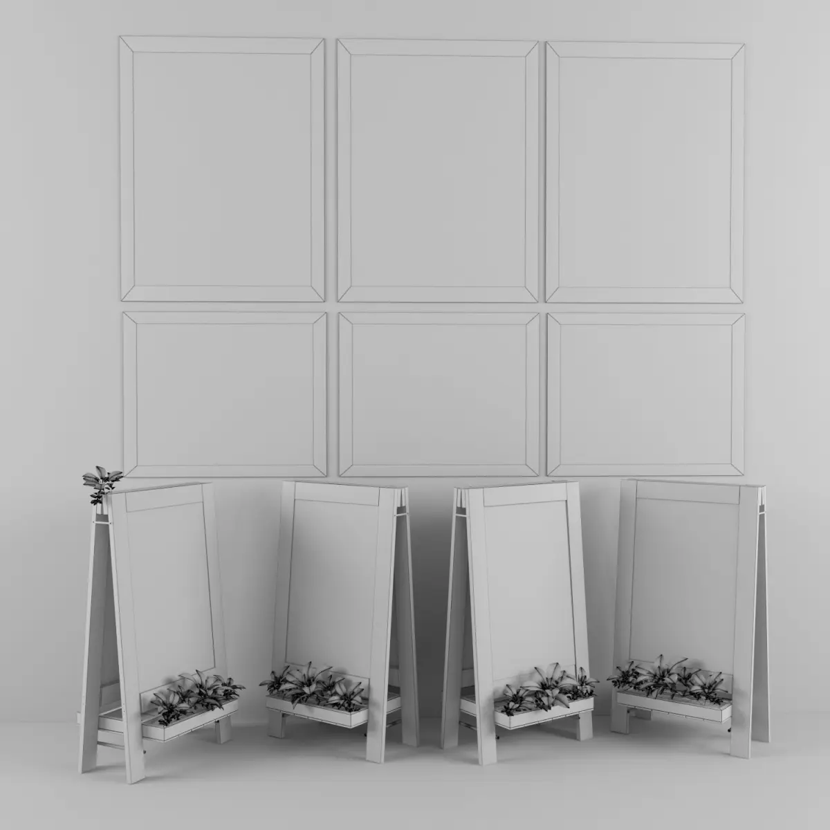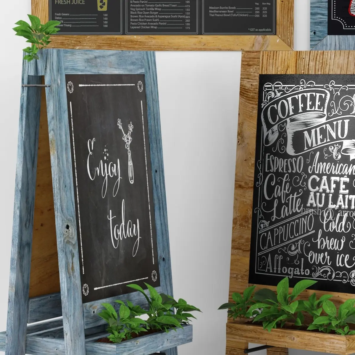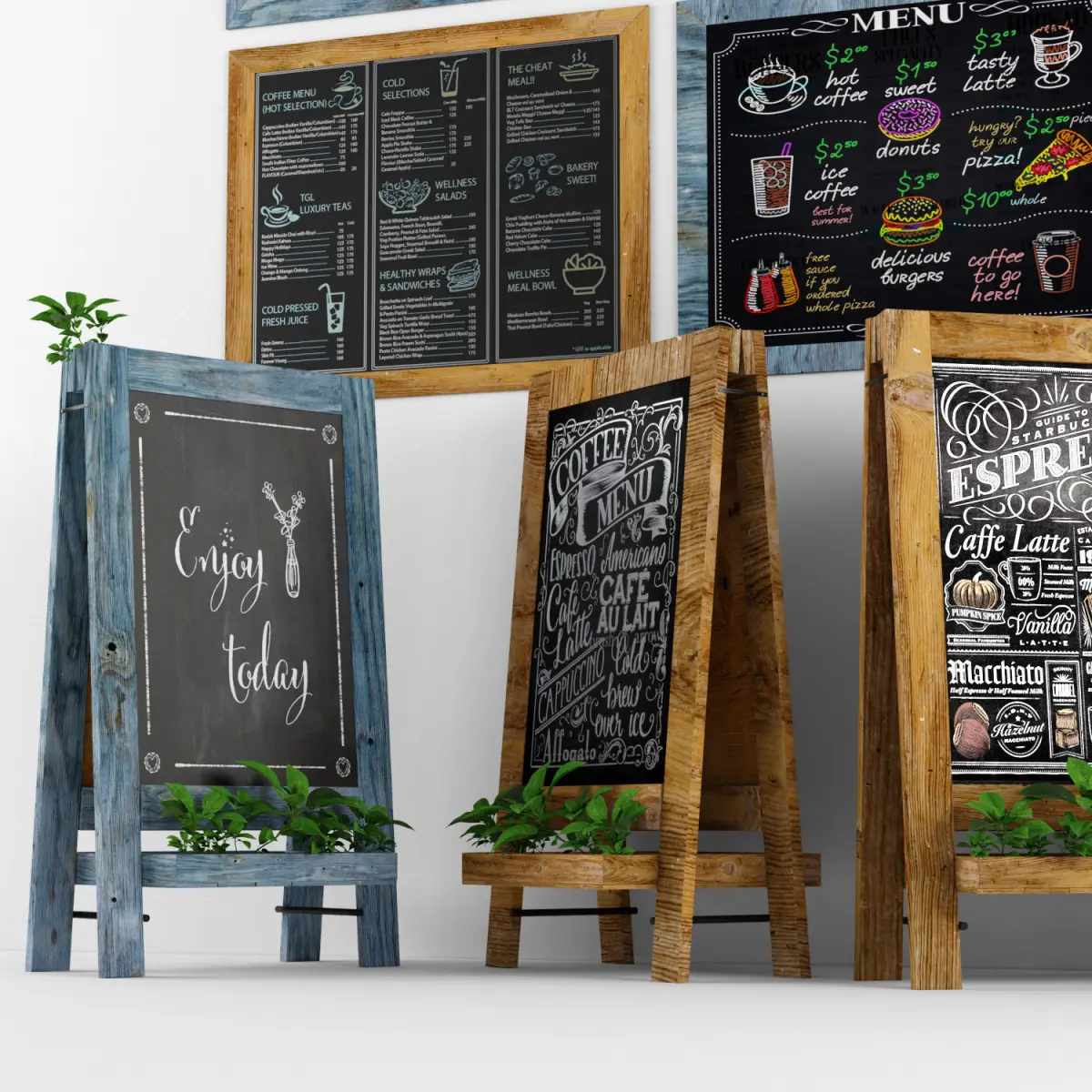 Set of colorful advertising chalkboards with plants. wood PBR texture blue, green, red