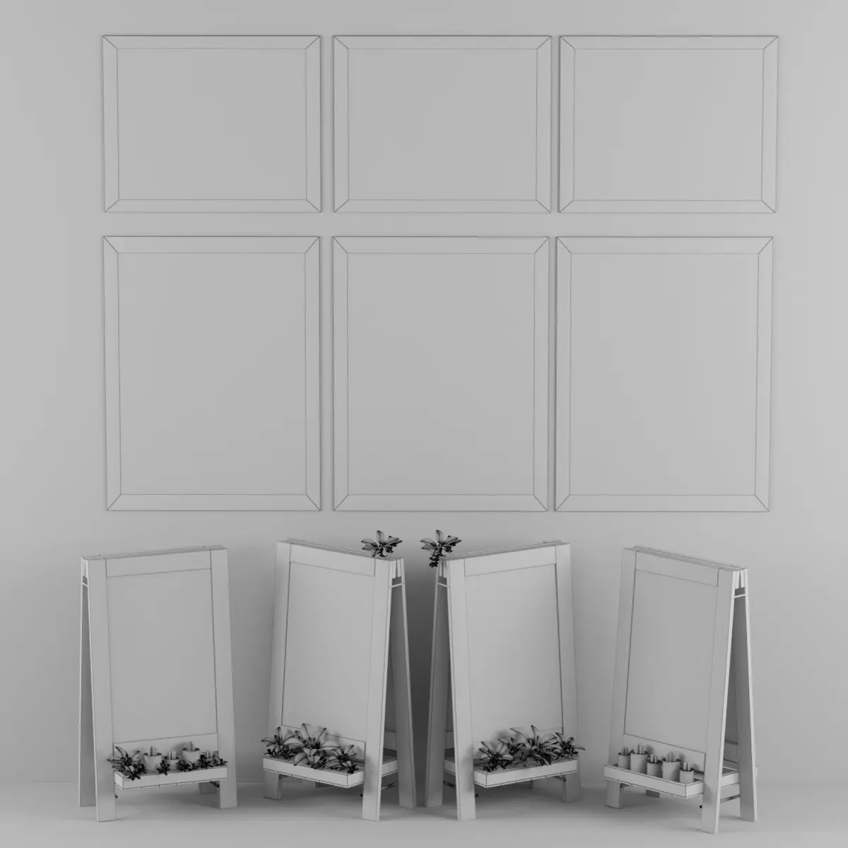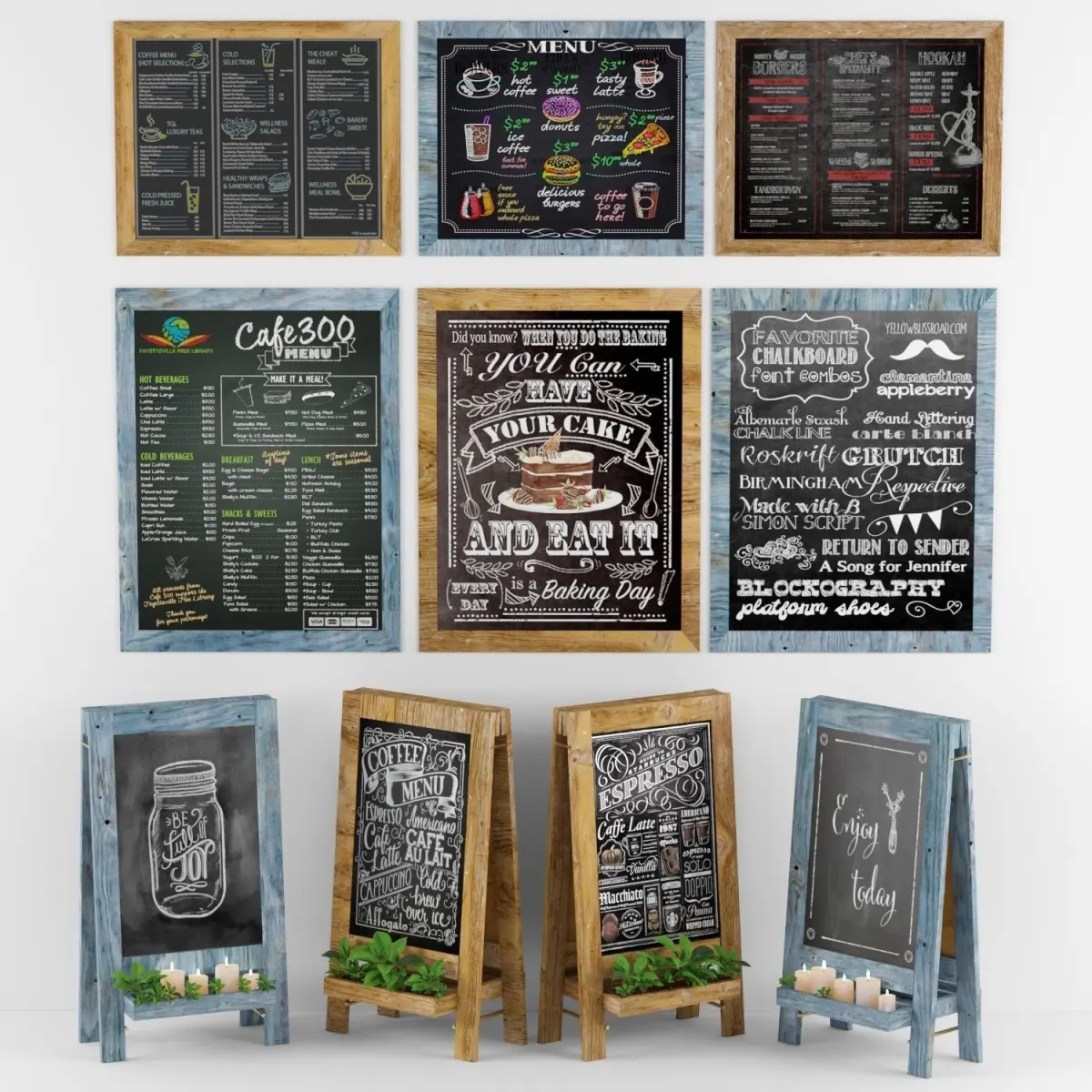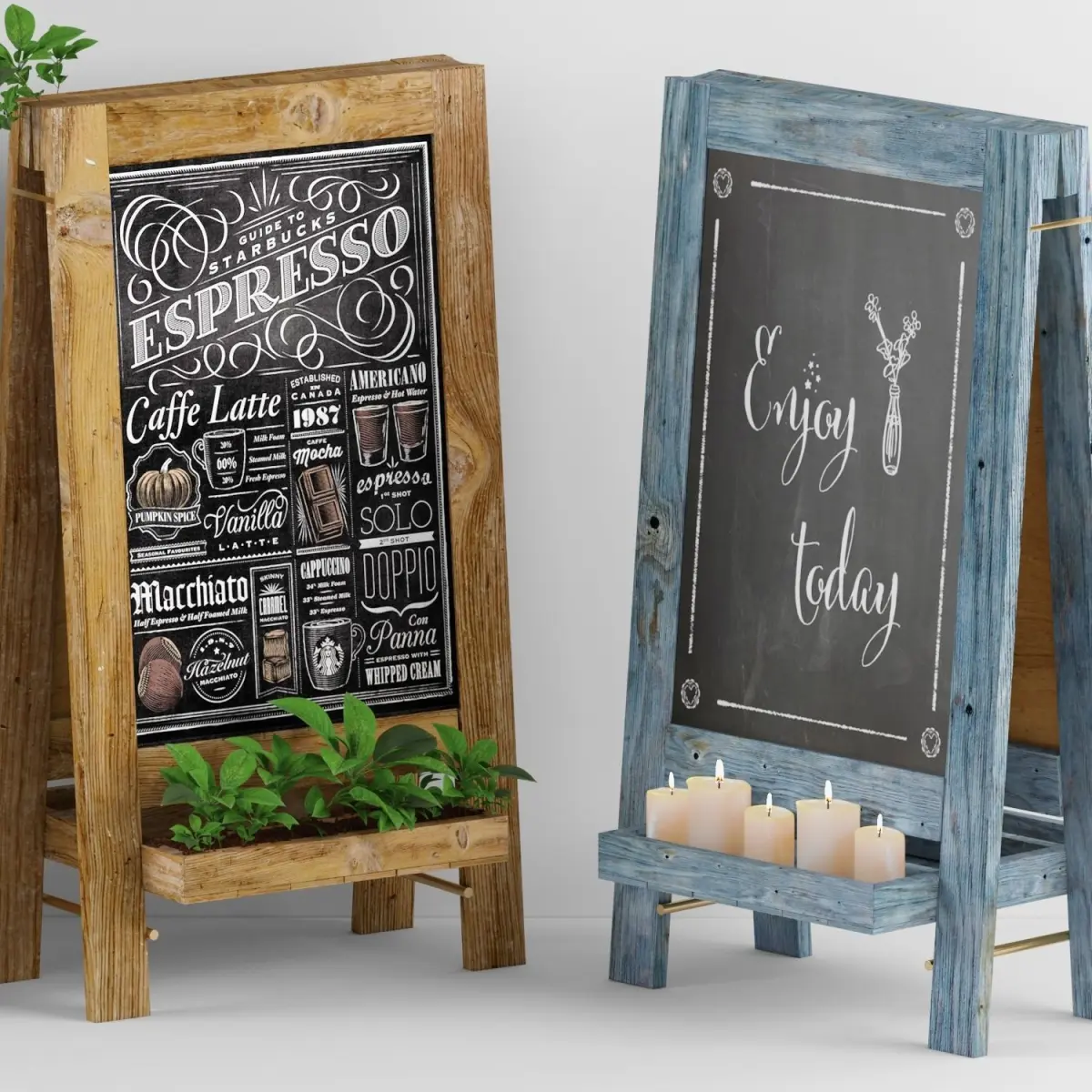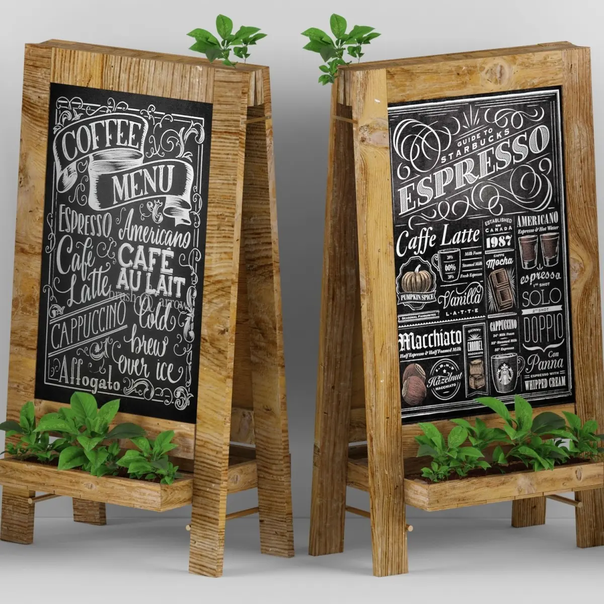 Set of colorful advertising chalkboards with plants.
