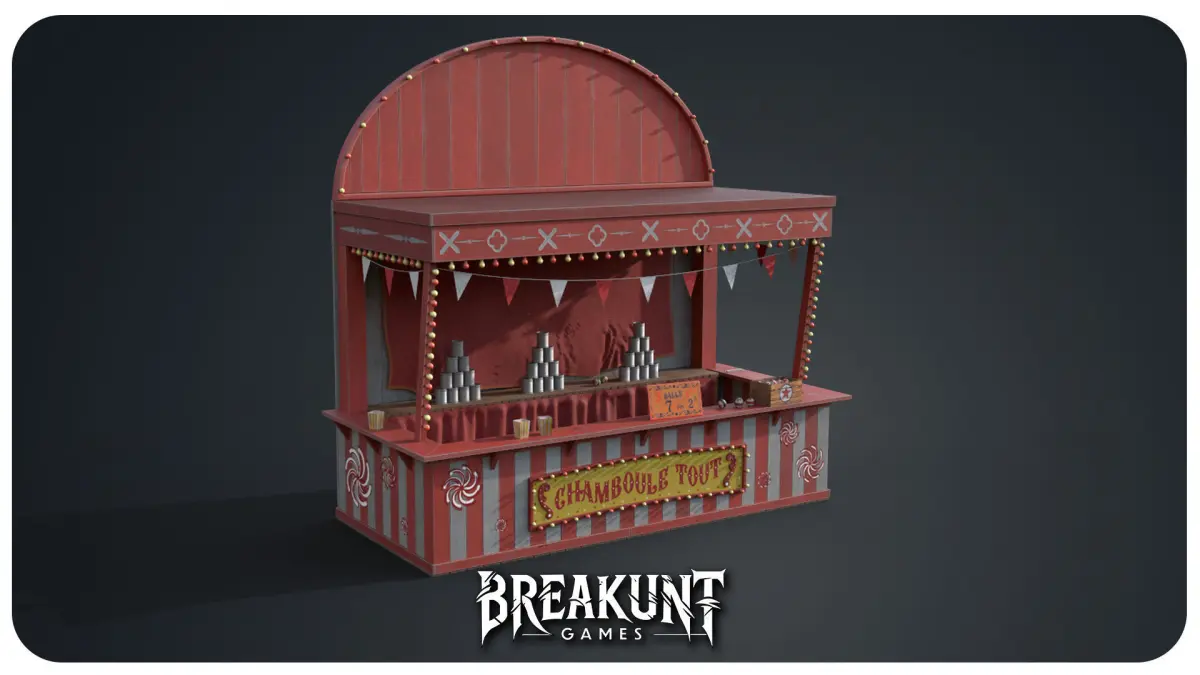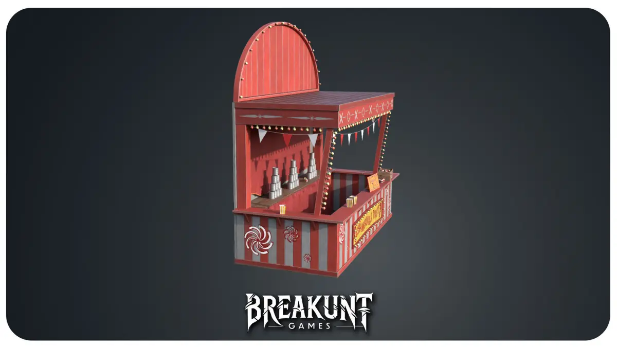 Tags :circus, carnival, festival, midway, funfair, fairground, chamboule tout, throwing game, carnivalbooth, circus booth, carnival stand, festival stand, knock down game, carnival props, vintage circus,retro carnival, wooden stand, red and white booth, game stand, carnival attraction, realistic carnival,horror circus, festival prop, 3d booth, tin cans, throw balls, pyramid cans, shooting game, fair booth,funfair attraction, game asset, low poly circus, optimized game prop