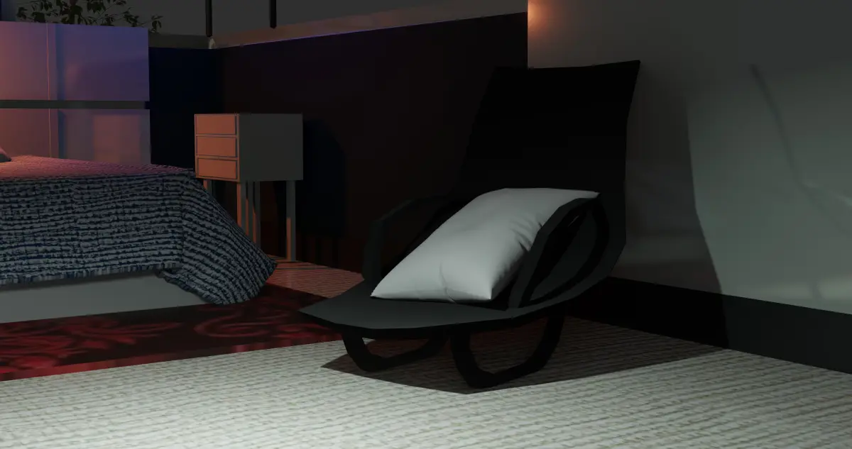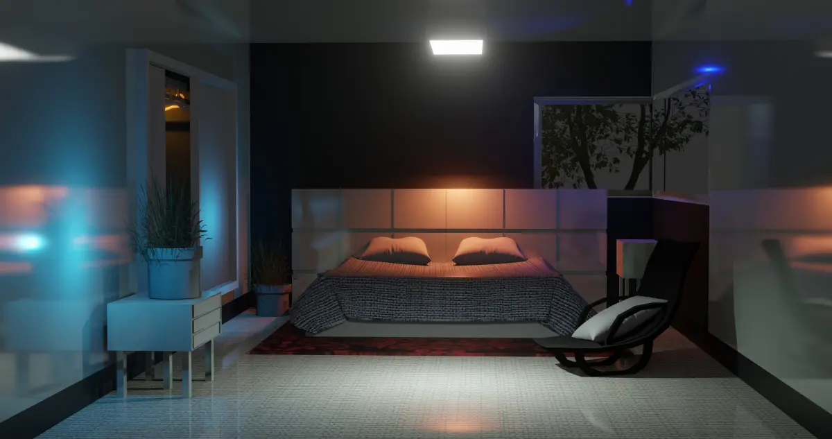 Cette chambre 3D présente un design moderne et épuré, alliant fonctionnalité et esthétisme. Les murs sont habillés d’une teinte neutre (blanc cassé ou gris clair) qui met en valeur l’éclairage naturel provenant d’une large fenêtre panoramique. Le mobilier se compose d’un lit double avec une tête de lit rembourrée, de deux tables de chevet minimalistes, et d’une armoire encastrée aux portes coulissantes.
