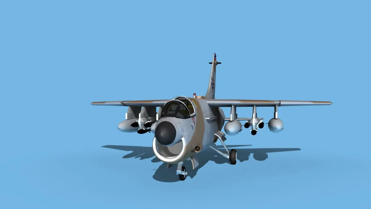The Chance Vought A-7E Corsair was one of a family of jet fighter bombers developed by Chance Vought Corporation for the US Air Force and US Navy during the 1960s. This model is the A-7C US Navy Version. Developed to be a replacement for the A-4 Skyhawk it was designed from the F-8 Crusader. Originally designed for the US Navy, it quickly was adopted to replace the North American F-100 and Douglas A-1H Skyraider with the US Air Force and Air National Guard Fleets. Over time the A-7 would be improved through several variant that included larger more powerful engines and better avionics suites. Corsair IIs would be used in several engagements including, Vietnam, the Invasion of Grenada, Operation Eldorado Canyon, and Persian Gulf War.