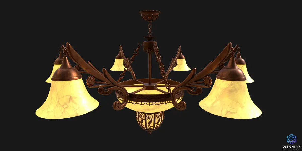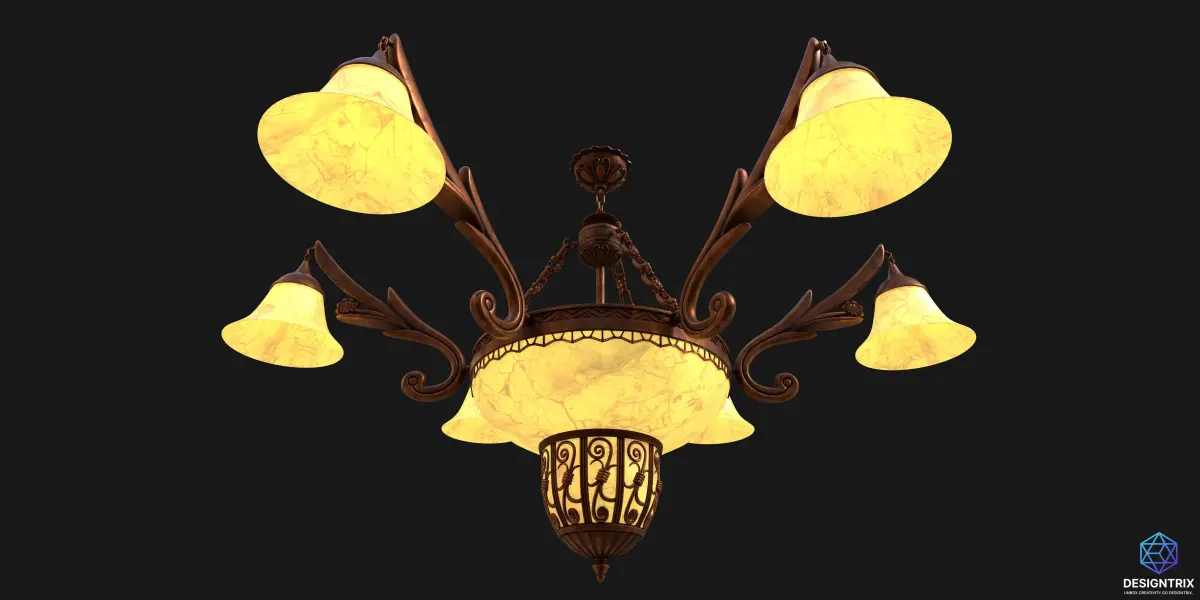This high-poly 3D chandelier features a beautifully detailed vintage design with a symmetrical six-arm layout, surrounding a central ornate bowl. Each arm supports a bell-shaped lamp shade crafted with a marbled yellow glass texture, providing a soft, warm illumination. The central bowl light mirrors this marbled glass aesthetic and is encased in a decorative bronze lattice frame that enhances its regal charm.