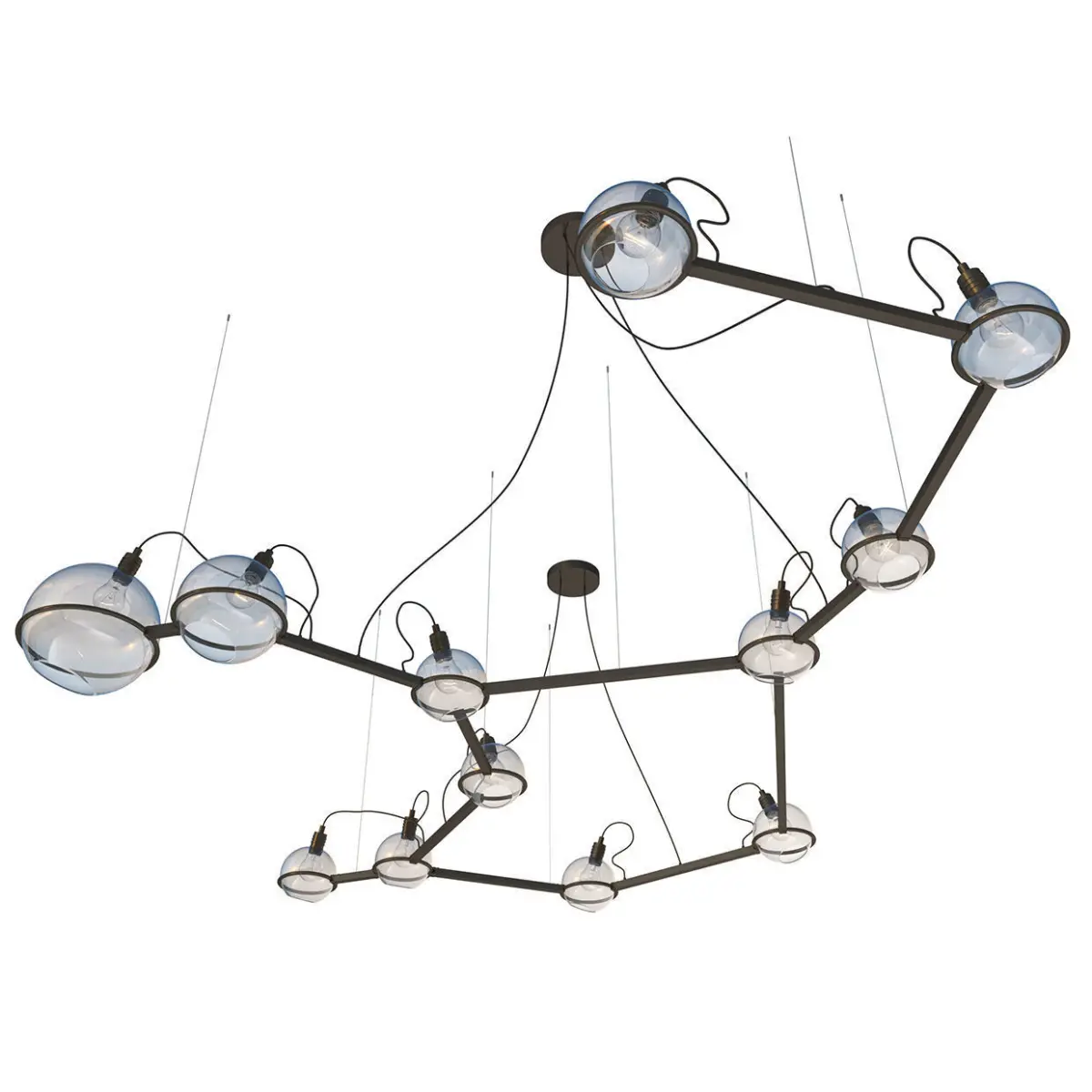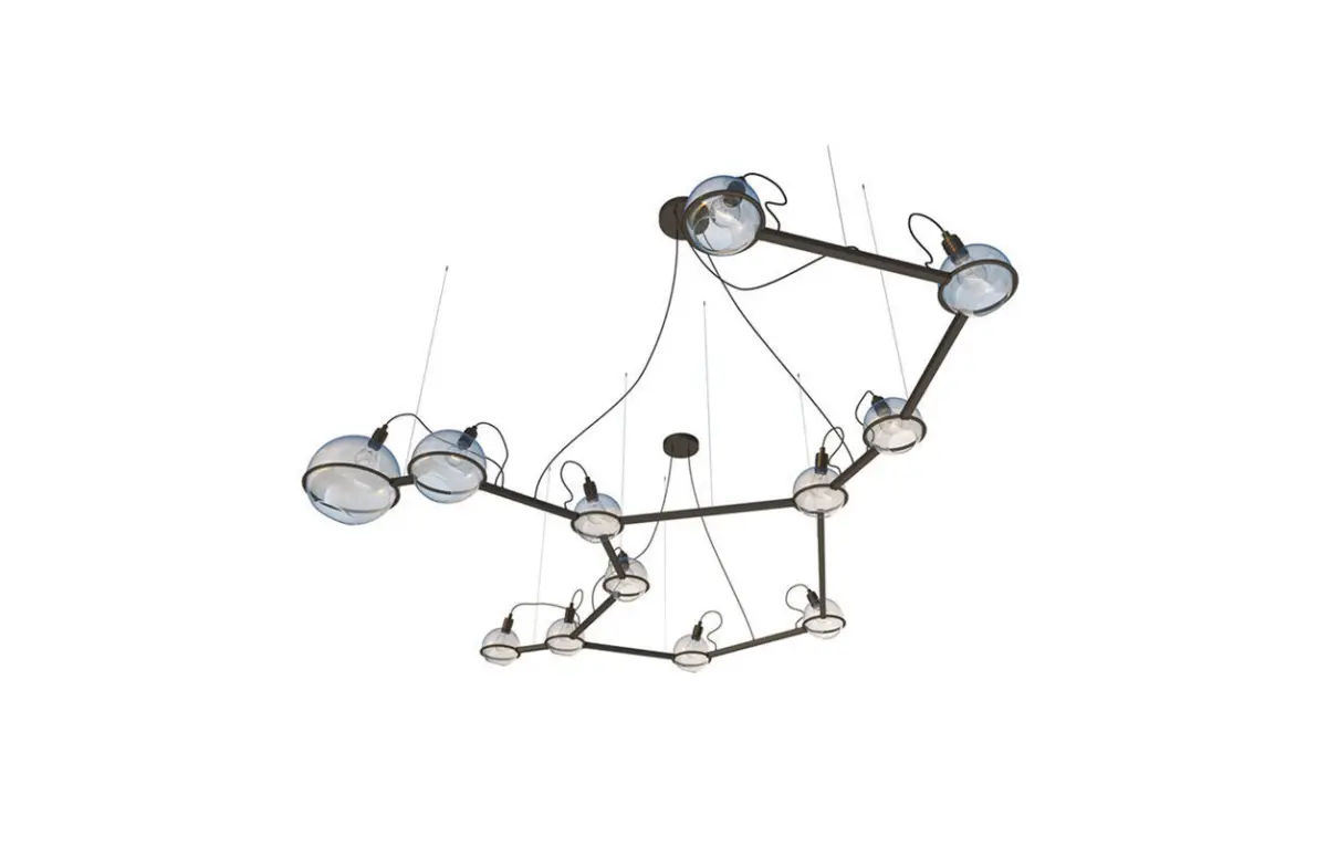 Chandelier Centaurus SKU.20921 by Pikartlights.The Spacelights series is a constellation for everyone. A HOROSCOPE IN METAL AND GLASS that illuminates any interior. Metal: brass, copper, Centaurus in your personal space. According to Greek myth, the centaur that ascended to the heavens is the immortal wise centaur Chiron, son of Cronus and the nymph Philyra, a scholar of science and art, and tutor to the Greek heroes Achilles, Asclepius, and Jason. Another mythological candidate for the constellation's prototype is the centaur Pholus, accidentally shot by Heracles with a poisoned arrow during his fifth labor. The constellation is included in Claudius Ptolemy's star catalog, the Almagest. Centaurus contains the triple star system Alpha Centauri, consisting of a bright binary star and a gravitationally bound red dwarf, Proxima Centauri. Proxima is the closest star to the Sun.Made of brass, glass, and steel, available in 4 colors. For more information please check the product page: