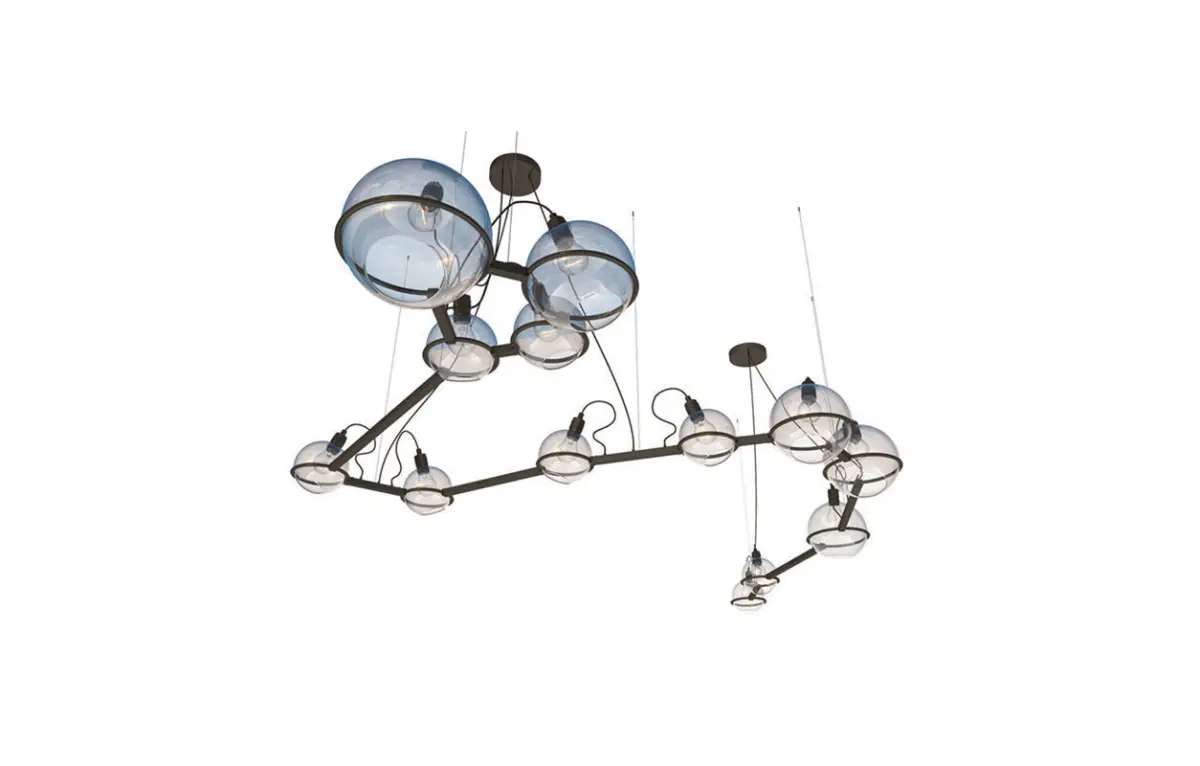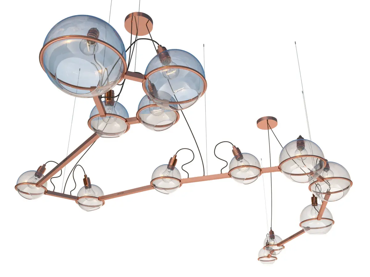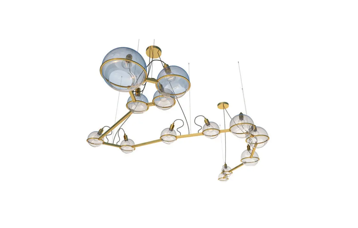 Chandelier Draco SKU.20923 by Pikartlights.The Spacelights series is a constellation for everyone. A HOROSCOPE IN METAL AND GLASS that illuminates any interior. Metal: brass, copper, chrome, painted metal. The Spacelights project is a constant in a changing space that makes you stop and find order in the stream of thoughts, closing the door to the daily hustle and bustle. The star is getting closer. Uniqueness in detail. The constellation of Draco in your personal space. Draco (Latin: Draco) is a circumpolar constellation in the northern celestial hemisphere, one of the best-studied constellations. The long figure of this constellation winds around the north celestial pole, encompassing Ursa Minor on three sides. The head of the dragon is easy to find directly north of Hercules, under its left, bent knee. But the long, winding body of the dragon is not easy to trace, as it contains many faint stars.Made of brass, glass, and steel, available in 4 colors. For more information please check the product page: