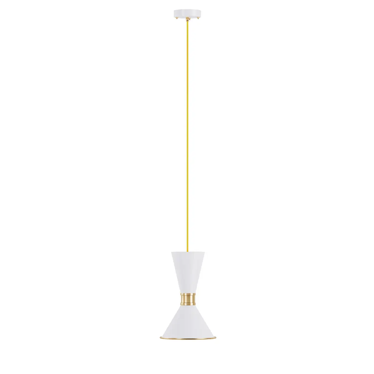 Pendant light Dualight, SKU.12515 by Pikartlights.The Dualights pendant light is another elegant model from the Dualight series. The expressive shade replicates the shape of an hourglass. This unusual geometry will accentuate the forms in any modern interior. Made of high-quality aluminum and brass - the noble shine of which complements the universal style of the matte shades.This is the only product in the Dualight series that contains only 1 light spot. For illuminating a space, you can effectively use several pendants of different lengths or even colors of shades - don't restrain your inner designer on the path to the ideal space.The series palette offers stylish combinations of trendy colors with brass - the pendant is available in white or black finishes, as well as a combination of these colors, and this is with the lower shades completely made of brass.The pendant looks great both as a standalone lamp on either side of the bed in the bedroom, in the kitchen, or, for example, in the bathroom. It will suit both Scandinavian-style lighting and as light in a classic interior. The golden sheen of brass will also complement a minimalist style or loft with this small expressive detail.Look at how three low-mounted pendants fit perfectly over the kitchen island, at the same time adding an interesting accent of forms but also complementing the stylish space. However, the Dualight series lighting is a great option not only for spacious halls or living rooms in your home. It is also stylish and functional lighting for a cool commercial project - for example, lighting for a stylish restaurant or cafe.Made of brass and aluminum, available in 4 colors. For more information please check the product page: