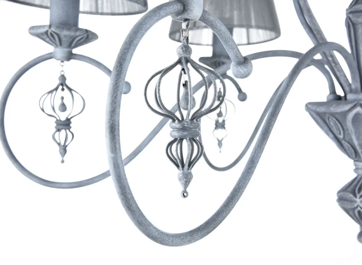 Frame and decorative elements made of metal. Lampshade of grey-coloured organza. Rahmen und Dekorelemente aus Metall in der Farbe Antikgrau. Lampenschirme aus grauem Organza.