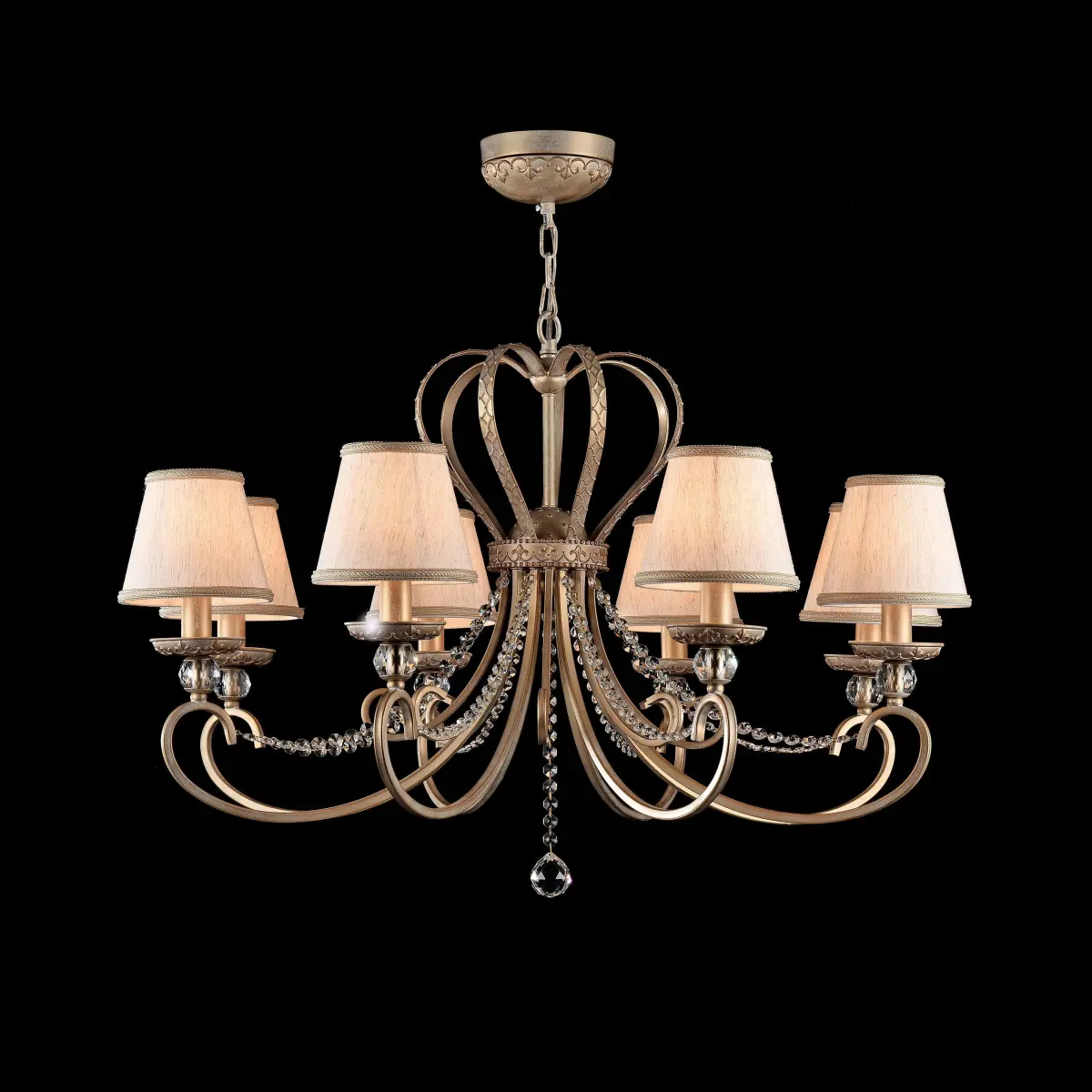 Metallrahmen mit dekorativer «Krone» und Ziermustern an den Lampentellern. Als Wandleuchte ergänzt durch einen Spiegel. Lampenschirme aus Leinen mit natürlichem Spitzengeflecht.Series: LivornoCollection: Royal ClassicStyle: Maytoni ClassicType of lamp: ChandelierHeight, mm: 610Height with suspension mount, mm: 1610Diameter, mm: 900Height of the ceiling cup, mm: 25Diameter of the ceiling cup, mm: 140Number of bulbs: 8Cap: E14Power: 40WFrame material: Metal Colour: Cream GoldMaterial of shade: Linen on PVC